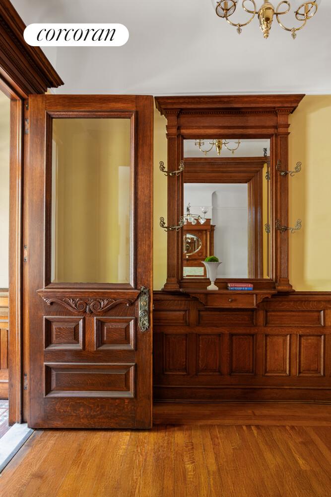 The parlor level welcomes you with a stately stoop, original wainscoting, and a pier mirror. The sun-filled living room sets the tone with parquet floors, a decorative fireplace, detailed ceiling medallion and original millwork. This inviting space flows into a generous bonus room-perfect as a family room, library, or additional office. Beyond original pocket doors lies a large bedroom, currently used as a library, complete with built-ins and another decorative fireplace.