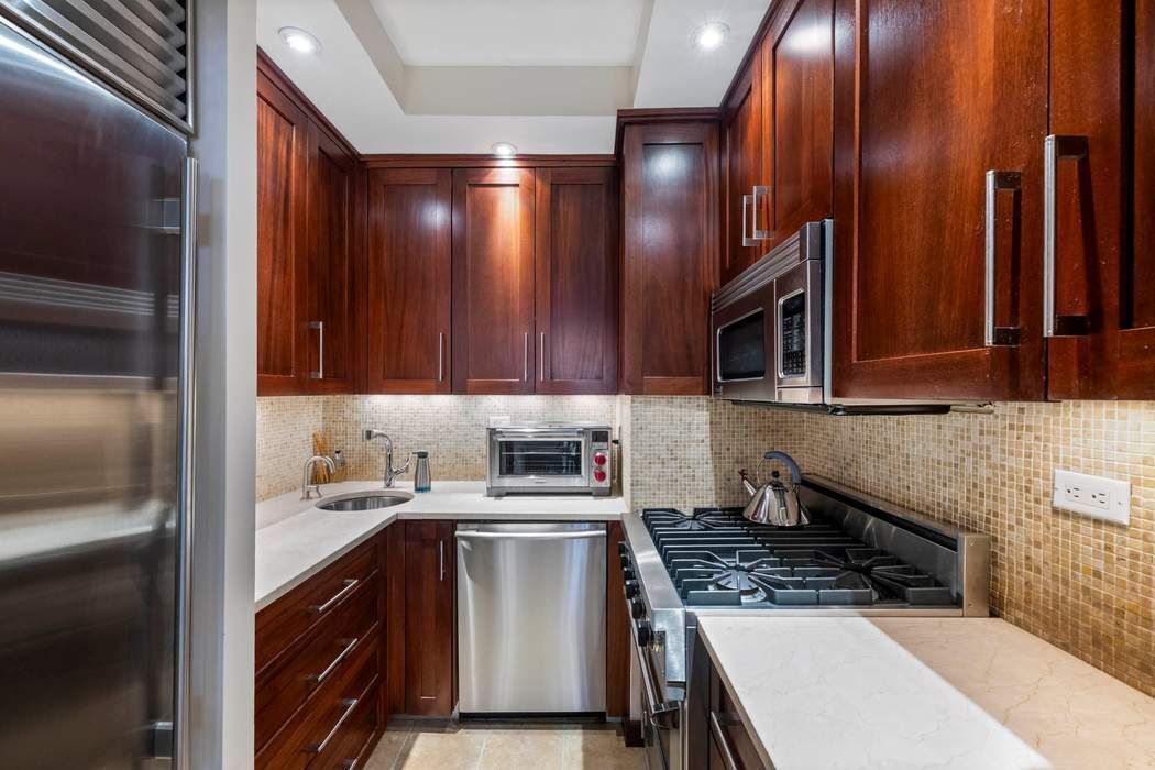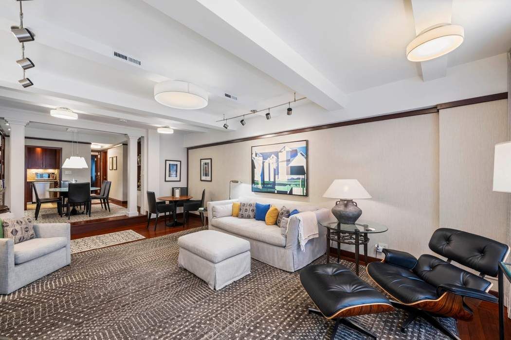 • Welcome to 3CD, an elegant and extraordinarily rare offering at The Westmore - one of the greatest pre-war Art Deco gems at Columbus Circle. This bespoke home is the result of a seamless combination of two units into one massive, turn-key two-bedroom, two-bathroom residence. This stately and impressive offering is sure to inspire the most discerning of buyers, with not a single detail overlooked throughout the renovation. From custom mahogany millwork and moldings, to immaculate herringbone floors, to luxurious grass cloth wallpaper, beamed ceilings, and tailored lighting, this offering has it all, serving as an astounding opportunity for one lucky buyer. Upon entering, you are immediately greeted with peace and quiet. The home welcomes you with a convenient entry foyer which leads in to your graciously proportioned living and dining room. Adorned with charming treetop views, sink in to this utterly private and tranquil space for the ultimate retreat from the busy city life. Lutron lighting, through wall air conditioning, and large, double paned bay windows elevate the room for maximum comfort. Off of the living room is your dining area, surrounded by custom built-ins and conveniently connected right to the kitchen. Equipped for standard nights in or entertaining guests, the combination of top-of-the-line Wolf Appliances, custom mosaic tile backsplash and countertops, and a properly allocated dining space makes for a pleasurable experience no matter the occasion. A combination of straight plank and herringbone wood flooring lines the hallways, leading you to the bedroom and bathroom suites. The home features well appointed, serene bedrooms designed for ultimate relaxation and restful nights. In the bathrooms, soft lighting, plush finishes, and a calming color palette create a serene atmosphere that feels like a personal sanctuary, inviting you to truly unwind. Travertine marble details evoke a spa-like ambiance, accompanied by high end finishes and efficient storage space to elevate your daily routine. Other apartment notables include abundant yet discreet closet space, brushed chrome hardware throughout, and a Miele Washer and Dryer in unit. This gem is not to be missed. The Westmore, located on West 57th Street in Midtown Manhattan—right in the heart of the world-renowned Billionaires' Row—is one of New York City’s premier Condops. A Condop offers the best of both worlds: cooperative ownership with the flexibility of condominium rules, including the ability to sublet freely and use the unit as a pied-à-terre. Designed by the notable New York architecture firm Boak & Paris, The Westmore features timeless Art Deco styling and adds a touch of elegance to the block between Eighth and Ninth Avenues. Residents enjoy a host of amenities including two beautifully landscaped roof terraces, a fitness center, full-time staff with 24-hour door attendant, live-in superintendent, bicycle storage, storage lockers, and a central laundry room. The building welcomes guarantors, gifting, co-purchasing, and parents buying for children. Subletting is permitted from day one with no restrictions. Pets are also welcome. Conveniently, major subway and bus lines are located just steps from the building's entrance, making city access effortless. Contact us for a private viewing of this extraordinary property today.