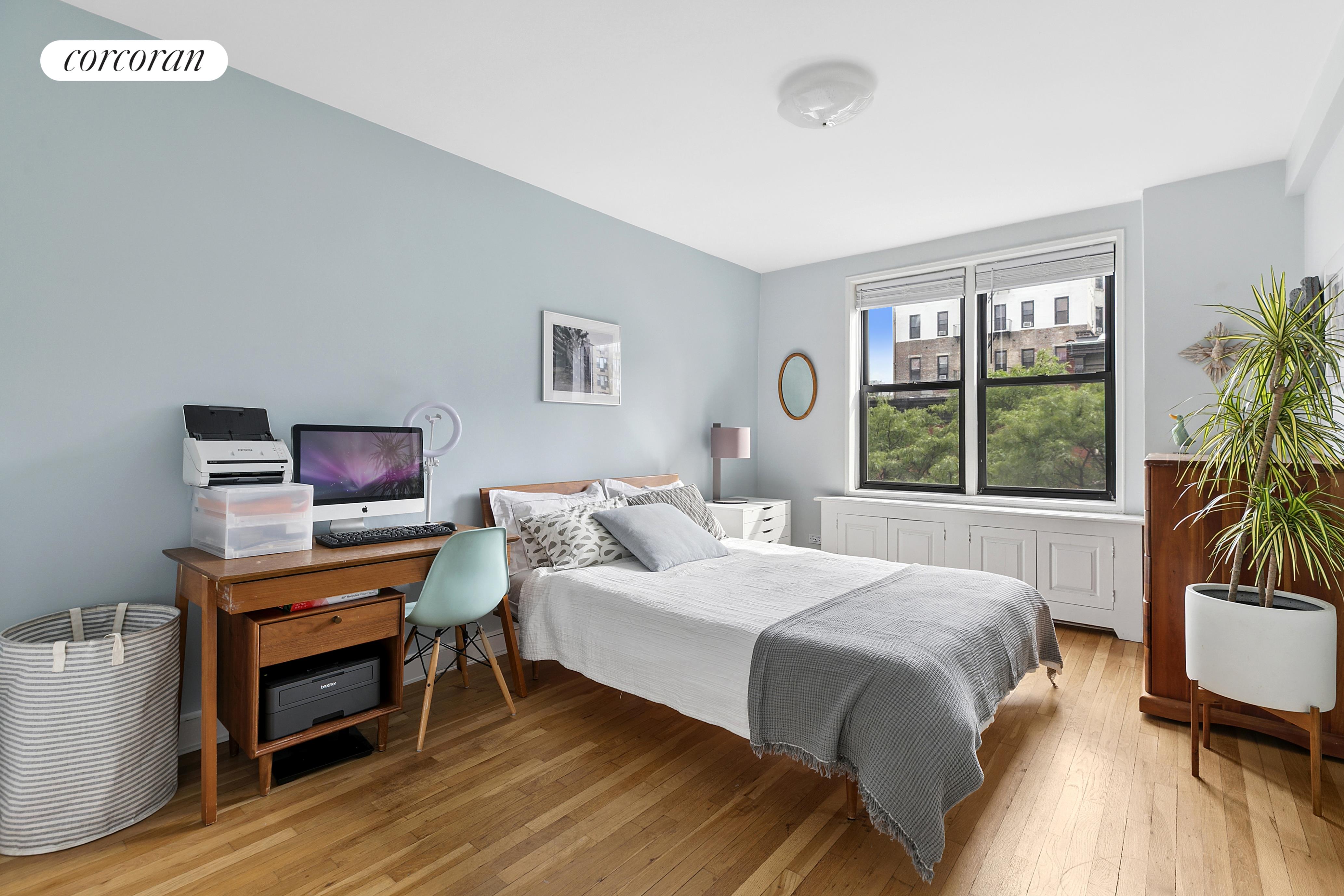With 9 windows and 4 exposures, the apartment enjoys natural light all day. The efficient layout includes a spacious south-facing living room with a dedicated dining area, and a king-size primary bedroom-both overlooking historic 18th Street townhouses with lovely treetop views. A windowed kitchen, oak hardwood floors, thru-wall A/C, and seven closets make this home both comfortable and functional.
