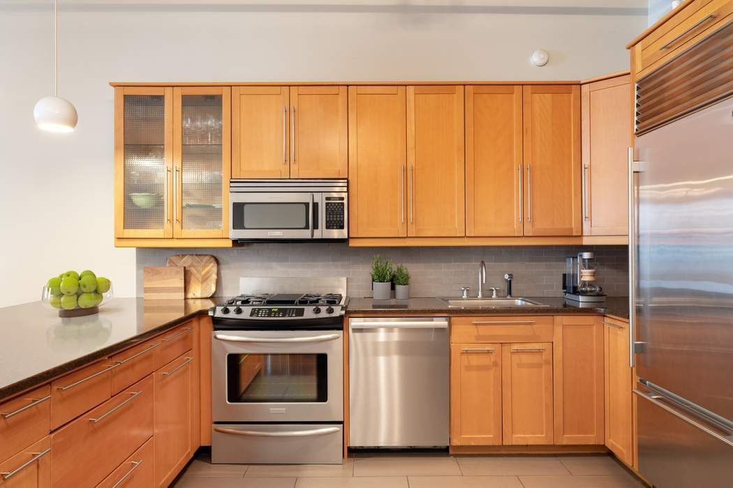The sleek, open chef’s kitchen features custom cabinetry, an oversized peninsula designed for gatherings, and top-of-the-line stainless steel appliances—all seamlessly integrated into a contemporary layout.