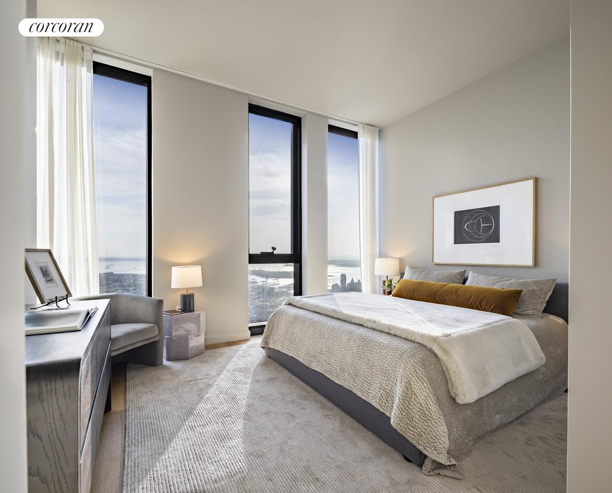 Designed by award-winning SHoP Architects, residence 58E is a generously proportioned 810 SF south-facing one bedroom, one bathroom home with ceiling heights up to 11 feet. Expansive floor to ceiling windows let in an abundance of natural light, framing sweeping views over Brooklyn, all the way to the Atlantic Ocean.