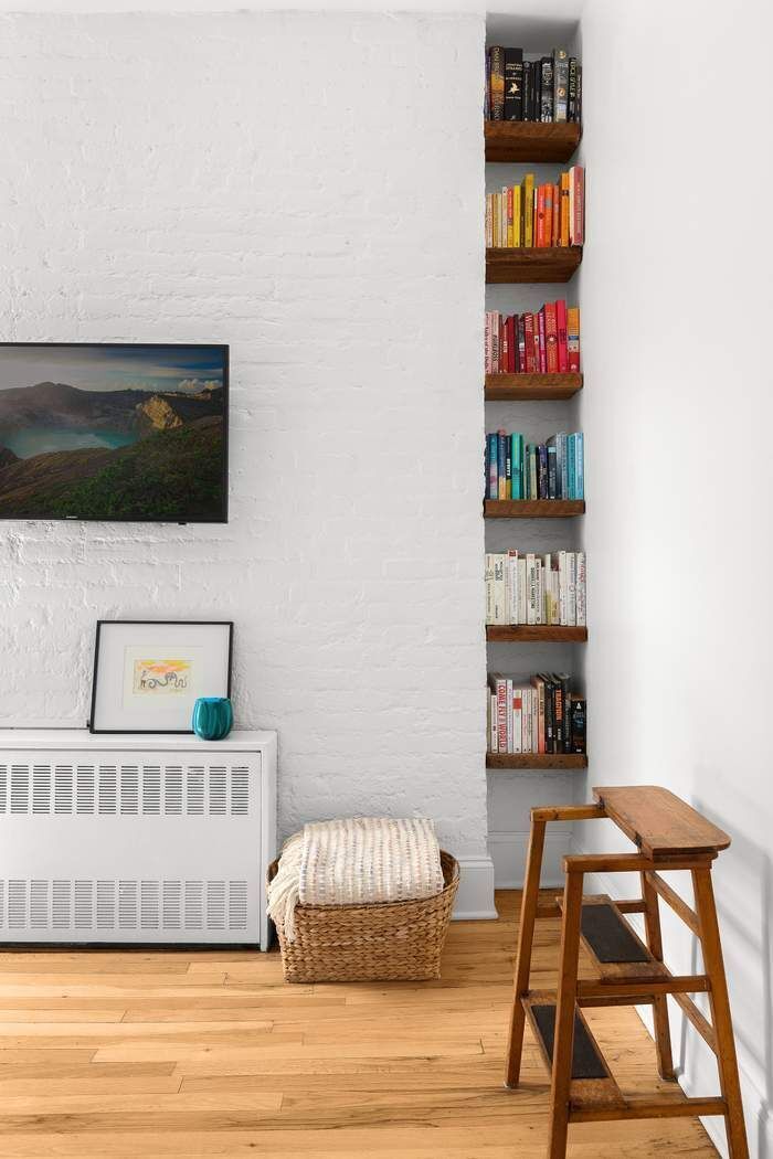 The sunny living room features southwestern light, a built-in reclaimed-wood bookshelf nook that runs to the ceiling, new Schoolhouse Lighting fixtures, and a new in-wall A/C unit. The queen-size bedroom offers a huge south-facing window, custom Rejuvenation sconces, and new blinds, through the wall A/C unit and a new adjustable Container Store closet system behind full-frame sliding doors.