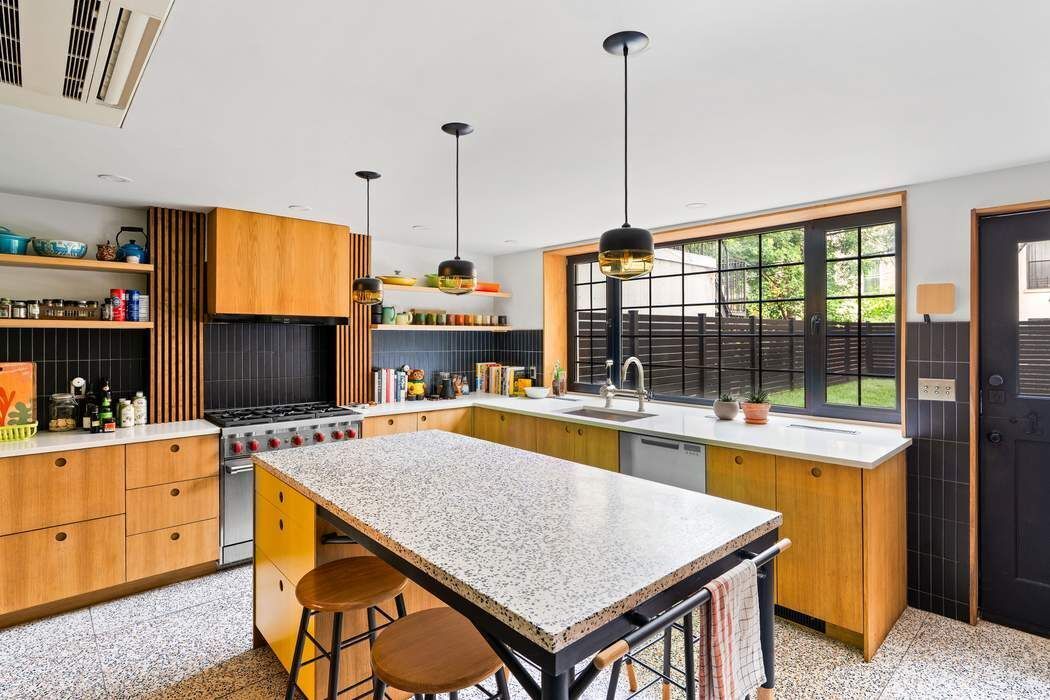 A private under-stoop entrance opens to a full-width garden floor, unusually elevated nearly to grade. The front room—detailed with paneled wainscoting and charismatic wallpaper—offers a cozy setting for a study, library, or media room. A zigzag transition between the chevron floors and terrazzo leads to the chef’s kitchen, which features Reform cabinetry, a custom concrete island, terrazzo counters by Concrete Collaborative, and Fireclay tile. Appliances include a Sub-Zero fridge, Wolf range, and integrated dishwasher. Natural light pours in through an oversized picture window and a two-part Dutch door that opens to the 45-foot-deep wildflower garden, complete with blue stone path way, plumbed natural gas grill, aluminum fencing, and integrated lighting—a private, flexible outdoor haven.