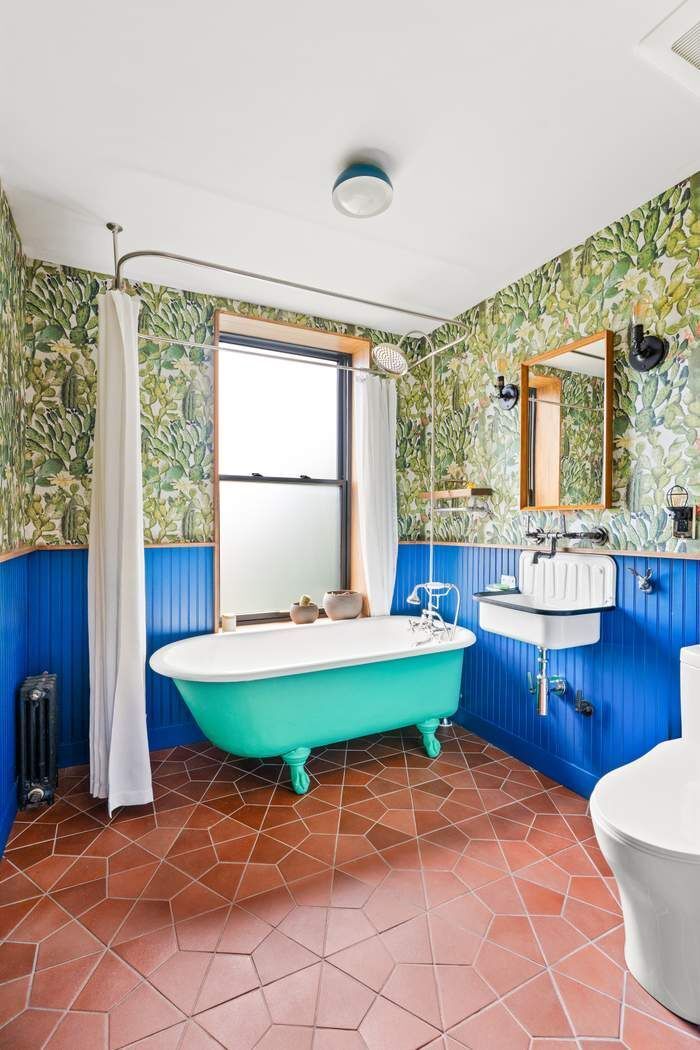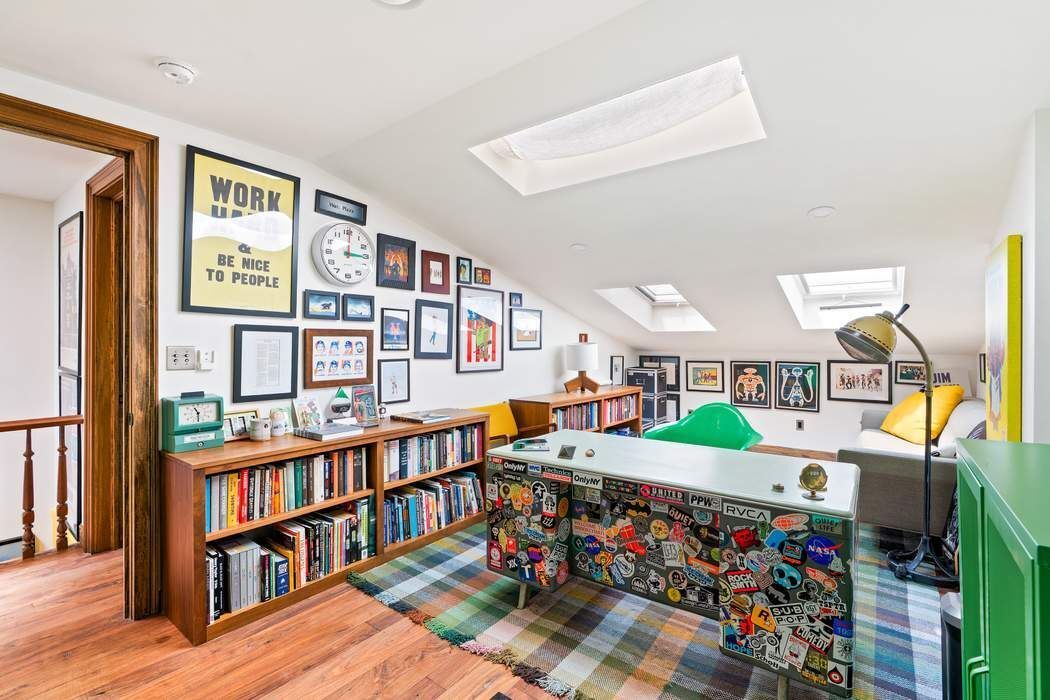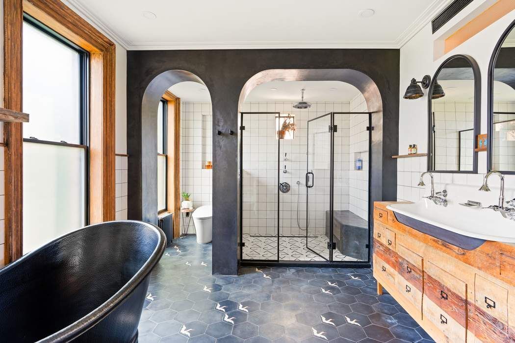 Two additional bedrooms sit under abundant light, each with its own character, as well as a third bedroom or home office with skylight. The top floor bathroom features a restored original clawfoot tub, Fireclay tile, and Watermark fixtures in a unified, show-stopping design.