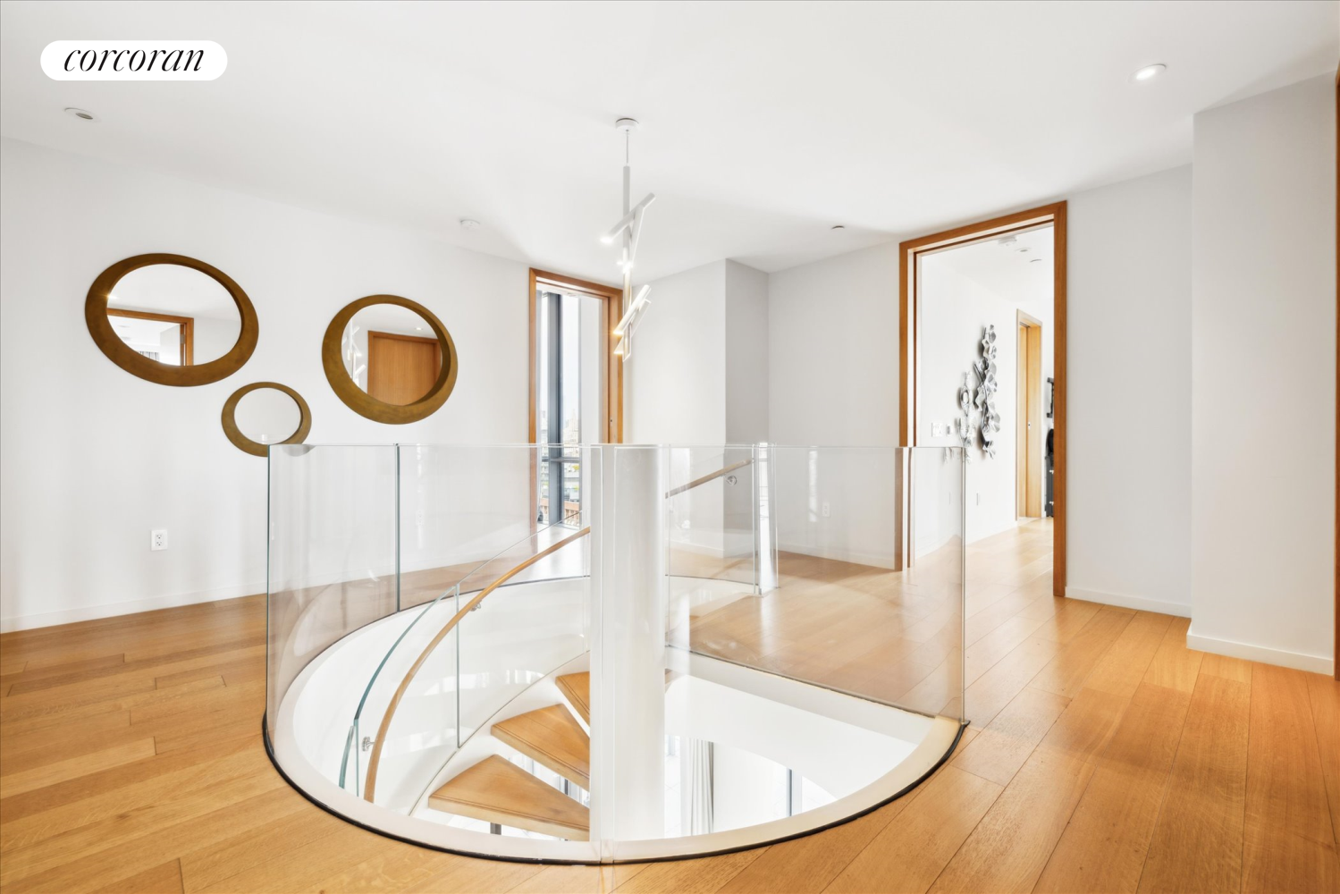 Upstairs, by way of a striking, architecturally significant and extra wide spiral staircase, a thoughtfully designed bedroom wing features four well-appointed bedrooms, including a luxurious primary suite with a spa-like bathroom boasting a deep soaking tub, glass-enclosed shower, and premium finishes throughout. Two of the additional bedrooms include en suite bathrooms, ideal for guests or growing households, and all of the bedrooms feature generous closet space and floor to ceiling windows overlooking the City. The second floor is also elevator accessible for maximum convenience and includes a quiet full-sized laundry room.