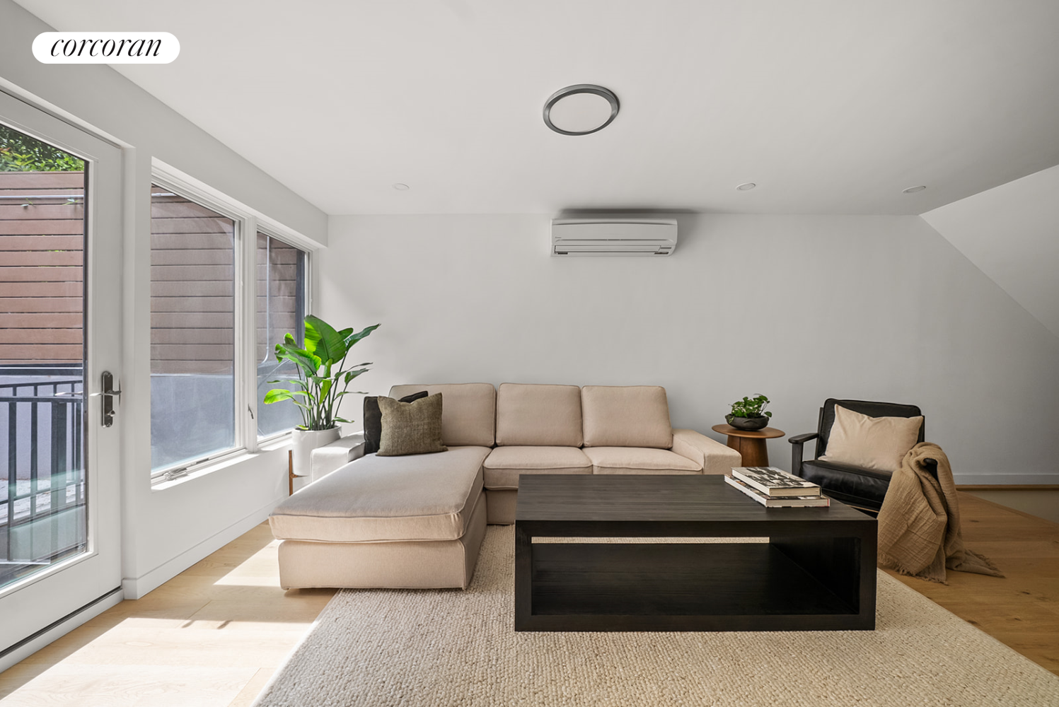Tailor-made to maximize the utility of every square inch, the home comes packed with amenities and luxury details. The large open-plan living space looks into a serene private backyard. The wide-plank engineered hardwood floors add warmth to the neutral palette. The expansive kitchen boasts beautifully veined stone countertops and backsplash along with a drawer microwave and double-door refrigerator. Modern conveniences do not halt at the individually controlled HVAC units, large panel windows, remote video intercom and a large in-unit laundry. All the bathrooms offer heated flooring to keep you toasty in the New York winters. Flanked by mature trees, the private back yard is a sanctuary in itself. An internal staircase in warm oak leads to the lower level. With high ceilings and a walk-out light-well, this oversized bright space offers plenty of options for use. Additionally, the roof deck offers panoramic views from the top of Prospect Park to the Statue of Liberty.
