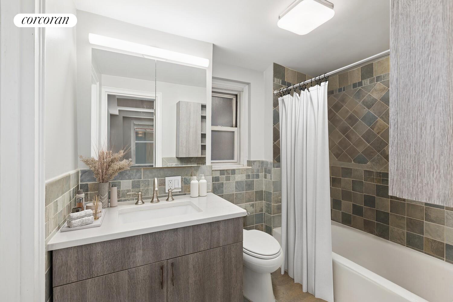 This home features a spacious living room and renovated kitchen with marble breakfast bar, Sub-Zero refrigerator, and stainless-steel appliance suite. The bedroom includes a built-in closet and ensuite bathroom, southern exposures.