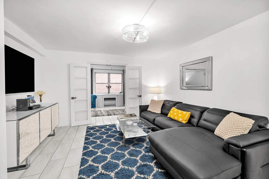 The immense, 30-foot-long living room provides fantastic flexibility, allowing it to be arranged as two distinct spaces - for dining, a home office, or even a second bedroom. Beyond the beautifully renovated kitchen, a large pantry closet provides abundant storage. Down a short hall past the renovated bathroom, the quiet bedroom offers a peaceful retreat. The bedroom is well-appointed with custom overhead storage and a walk-in closet and is flanked by three additional closets in the hall.
