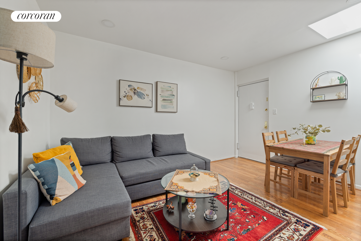 This top-floor, fully renovated, bright and airy condo, offers a sweet floorplan. Starting with a comfortable living room with dining area highlighted by a beautiful skylight that fills the space with natural light. Originally a large one-bedroom, the apartment has been thoughtfully reconfigured to function as a Two-bedroom, offering versatile options for a study, nursery, guestroom or home office - with direct access to a private balcony featuring serene tree top views. Additional upgrades include brand-new flooring, recessed lighting, a modern kitchen and bathroom, a sleek sliding glass door with wall partition for added privacy, and a new in-unit washer and dryer. Heat, hot water, and gas are included in common charges!