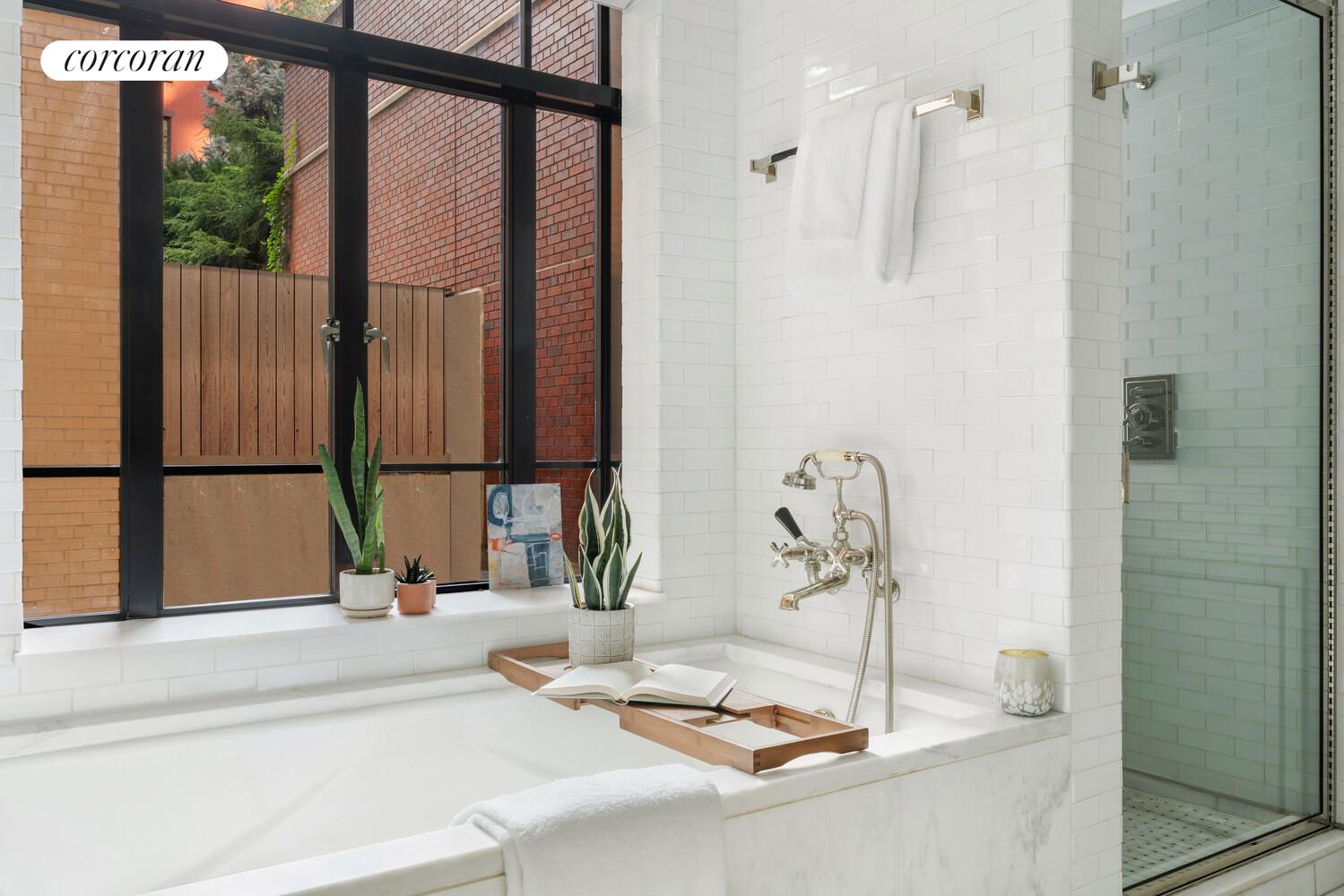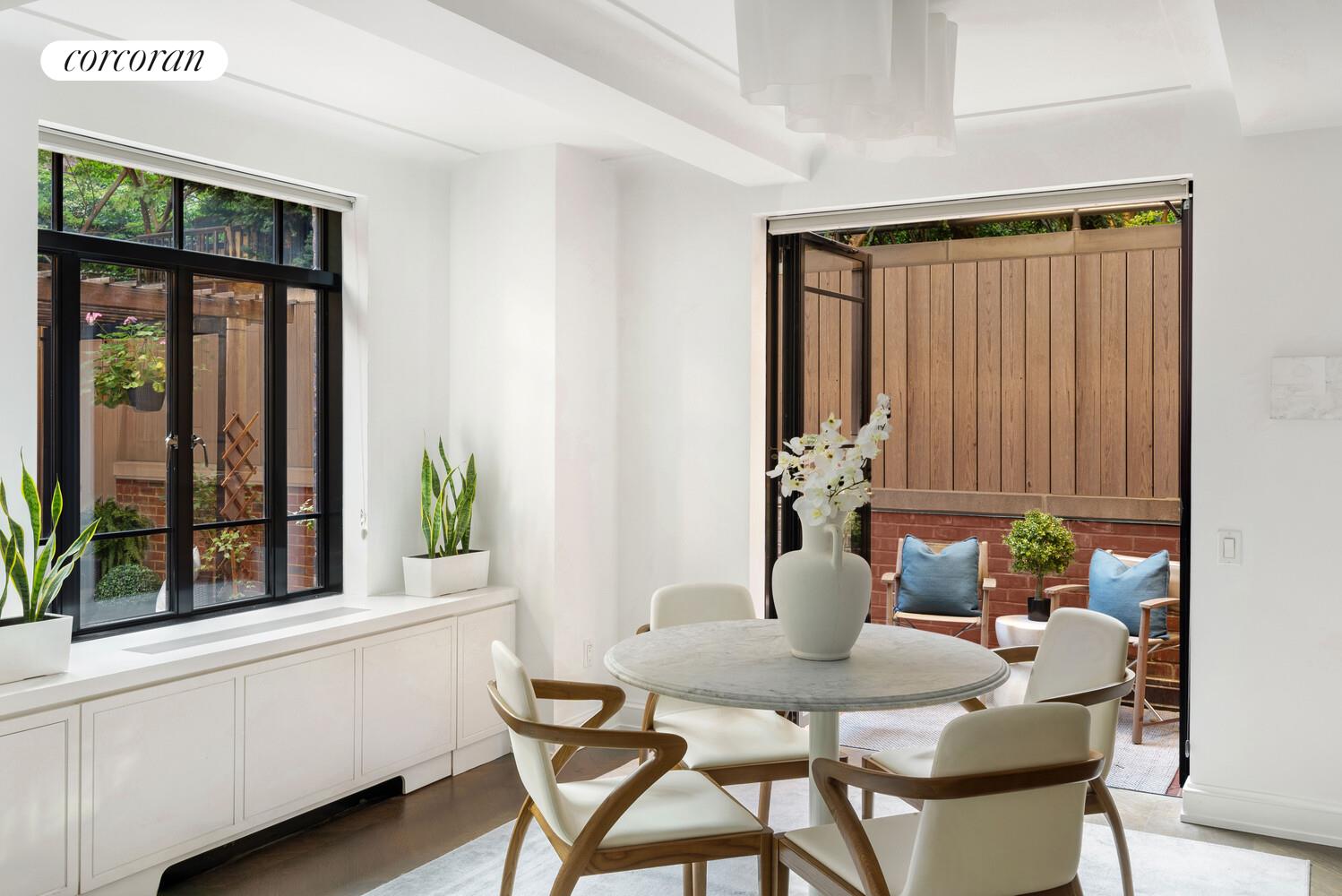 The sunken living room is generous in scale and grounded in calm. It opens directly onto the garden-lush, quiet, and almost improbably removed for a building in the center of downtown Manhattan. The flow is intentional. A windowed dining area connects to a west-facing kitchen with Nanz hardware, Viking appliances, and materials that are built to last.