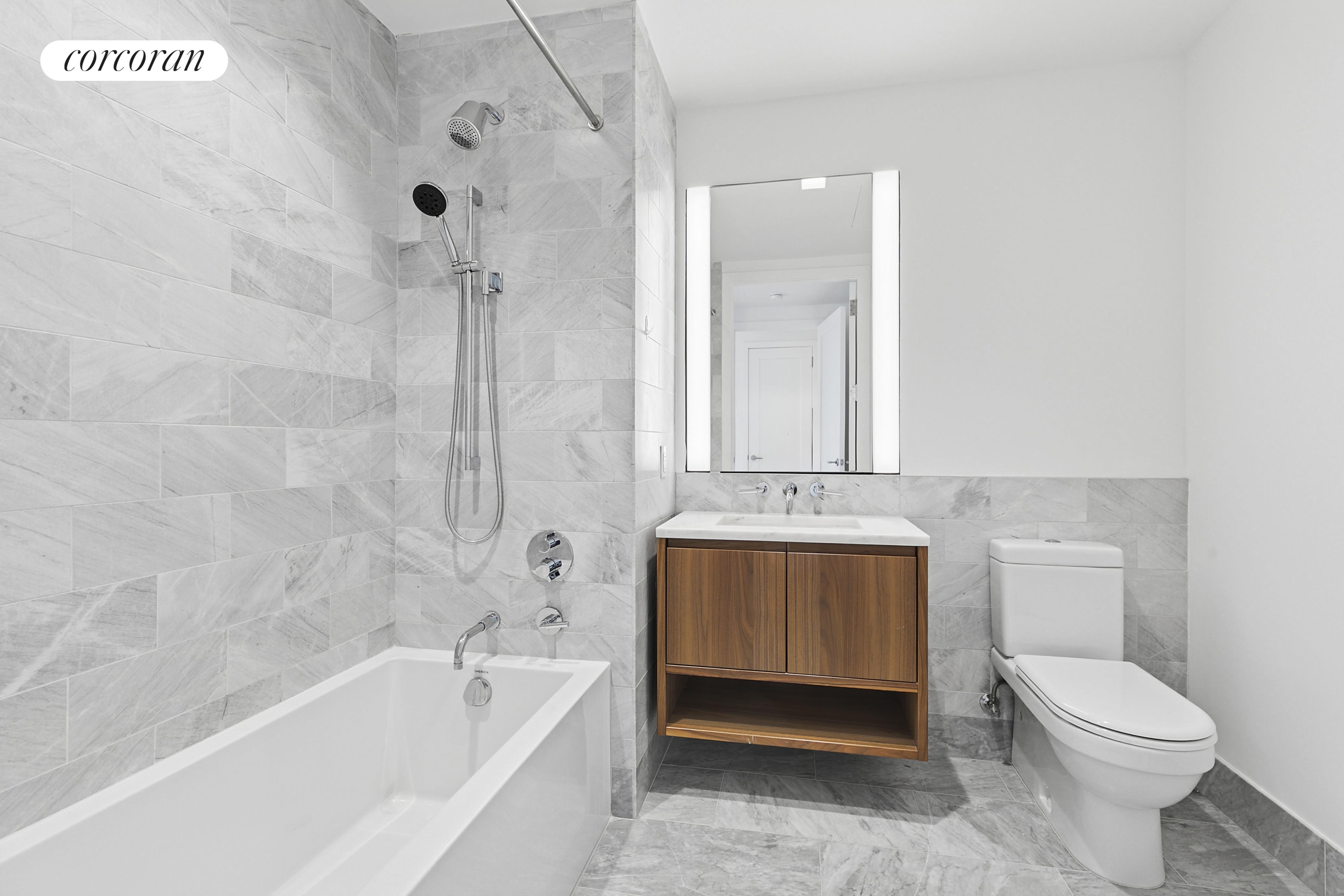The primary suite features two generous walk-in closets and a spa-like bath with radiant-heated Alanur-honed marble floors, Imperial Danby countertops, a custom walnut vanity, and a glass-enclosed shower with thermostat and volume regulators. The secondary bedroom offers its own ensuite marble bath with a deep soaking tub. A stylish powder room with honed marble finishes, a Corian vanity, and floor-to-ceiling mirror completes the home. Additional features include electric blinds in all windows, an in-unit washer/dryer and a large private storage unit.