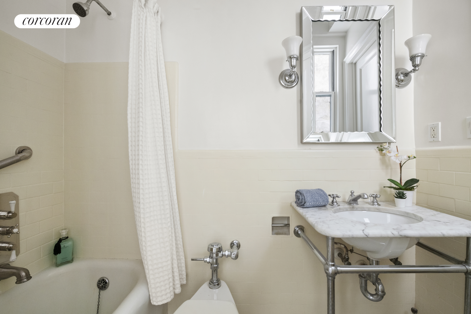 Through an arched entryway is the elegant bedroom, featuring double exposure triple windows and a space that can be adapted into a dressing room with ample closets. The separate dining room could double as a study/library with room for a pull-out couch. The windowed, galley kitchen is waiting for its design update. The full bathroom is a nice size with an original cast iron tub and Carrara marble pedestal sink. This special apartment features a lovely foyer entry with hall closet and beautiful, polished hardwood floors. Thru-the-wall air conditioning is permitted.