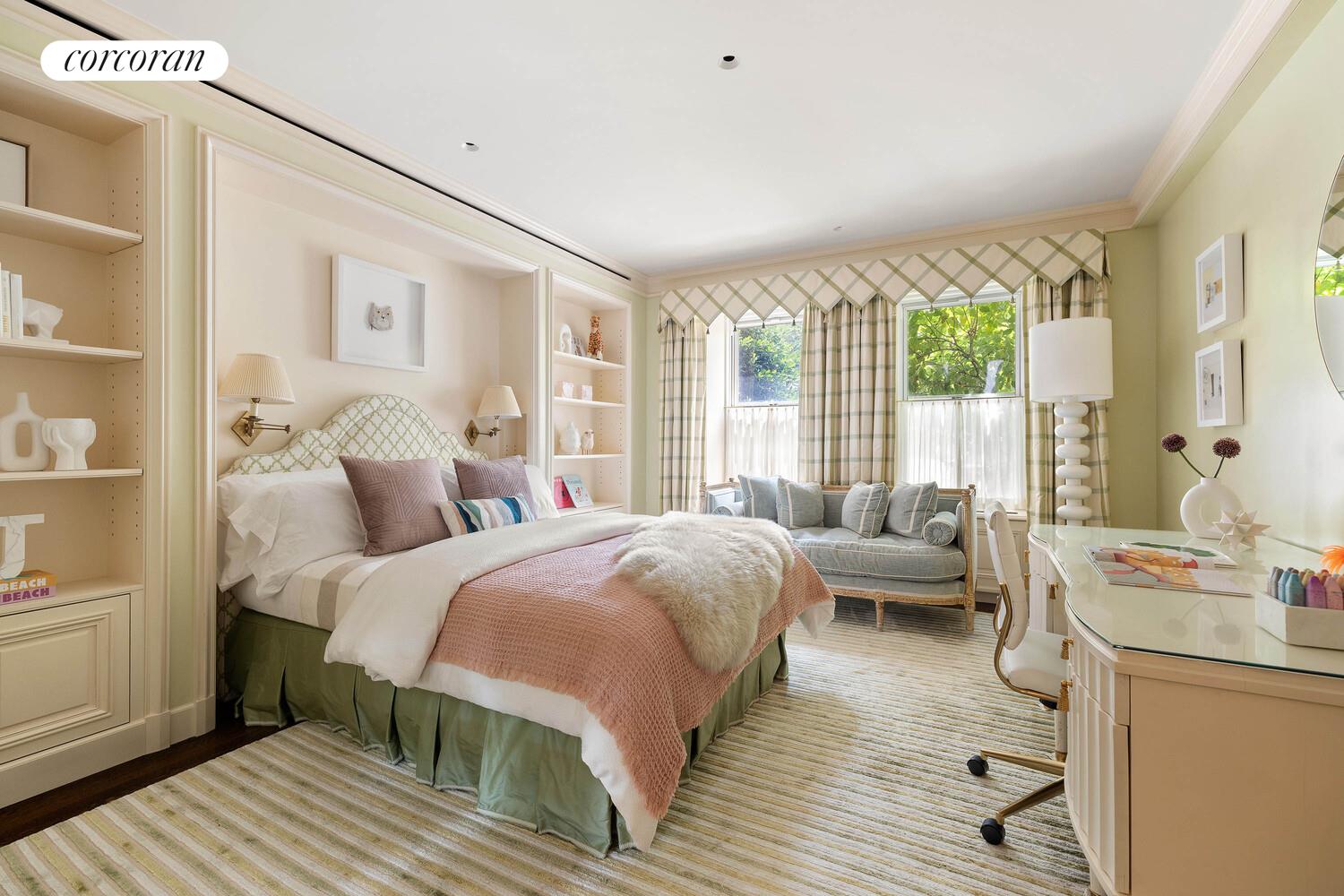 The primary suite is a light-filled, airy retreat facing south, offering warmth and sunlight throughout the day. Thoughtfully appointed with custom millwork, a built-in storage closet, and generous proportions, it provides a serene and elegant escape. The luxurious en-suite bath is clad in floor-to-ceiling marble and features a double vanity, deep soaking tub, oversized rain shower, and timeless brass fixtures.