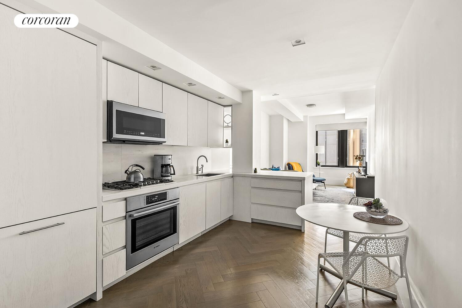 The elegant open concept chef's kitchen with top-of-the-line appliances has storage abound and a custom island. It features white oak wood finished cabinetry, beautiful marble countertops, and a full suite of stainless steel Bosch appliances.
