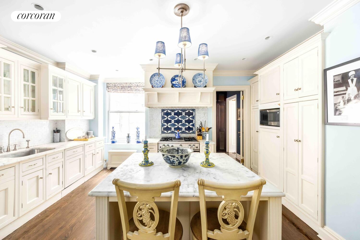 Flowing seamlessly from the living room is a stunning formal dining room-a true showpiece for any host-complete with a custom wet bar, wine cooler, and a marble-clad powder room that reflects the home's attention to luxury and comfort. The eat-in kitchen, masterfully designed by Clive Christian, is a chef's dream, featuring handcrafted cabinetry, marble countertops, a center island, top-of-the-line appliances, clever storage solutions, and a sunlit breakfast bar for everyday dining.