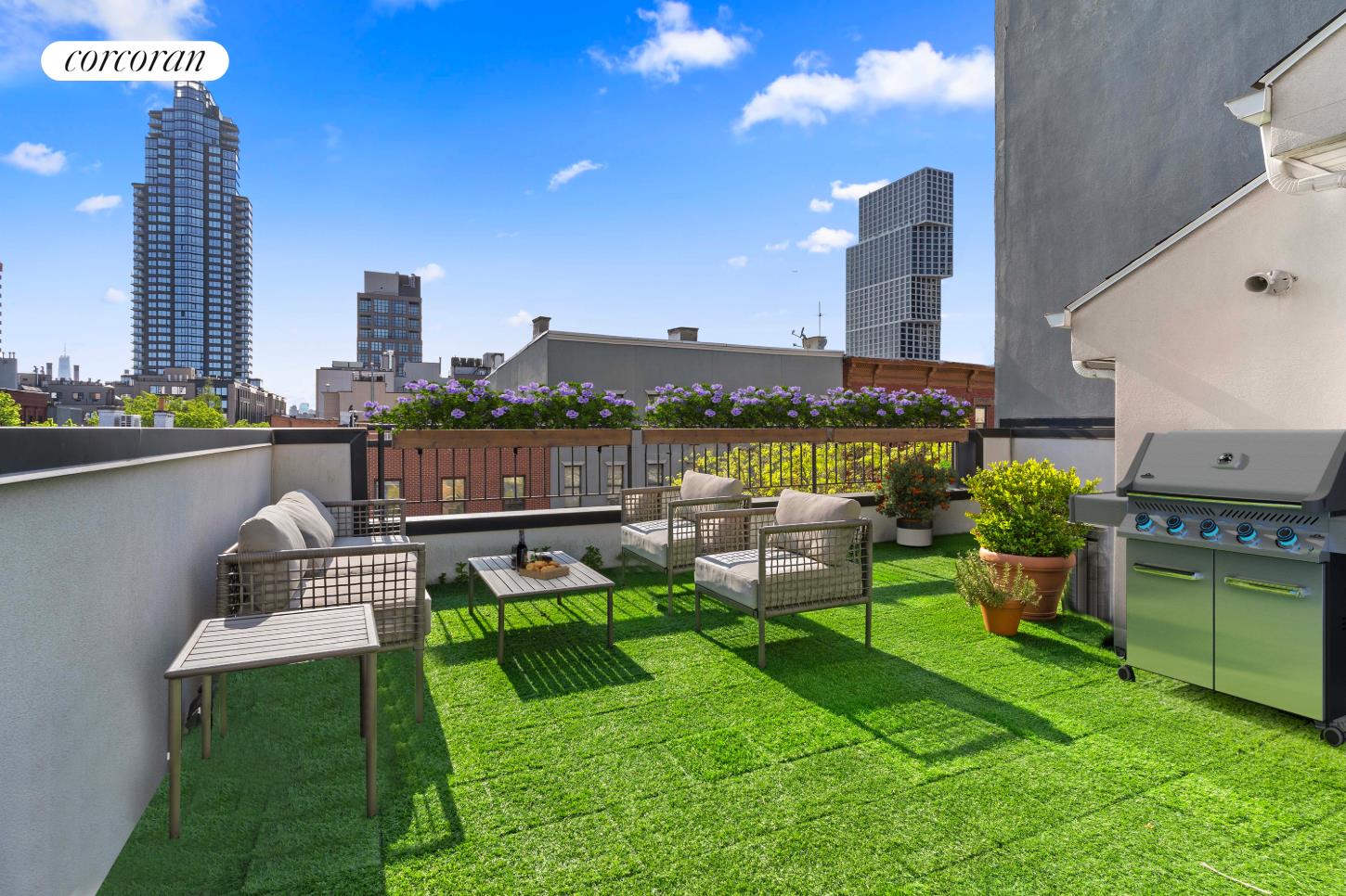 The property is configured as a two-unit residence over store, featuring a full-floor two-bedroom, one-bath apartment with private outdoor space, a spacious 3.5-bedroom, two-bath penthouse with a rooftop terrace, and a ground-floor retail space that includes a private yard and a finished lower level. This thoughtful layout offers exceptional income potential while providing the flexibility to occupy part or all of the residential section. Whether maintained as a high-performing investment or converted into a luxurious single-family home, the design and scale of 212 Franklin rival the finest townhouses on the market.