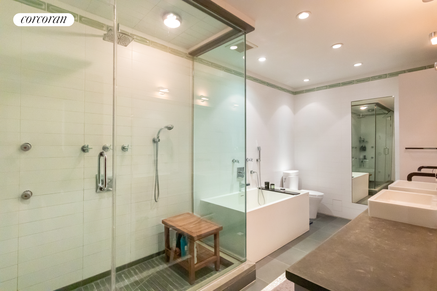 A hallway leads to a spacious laundry/mechanical room equipped with a full-size washer and dryer, followed by a beautifully finished full bathroom. The secondary bedroom offers charm and character with exposed brick walls and dual north-facing windows, while the impressive primary suite also showcases exposed brick, abundant light, a generous walk-in closet, and a luxurious en-suite bathroom with a soaking tub, oversized shower, and double vanity. Additional highlights include soaring 9-foot ceilings, central air conditioning, and a dedicated private storage cage.