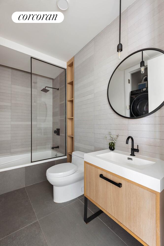 Additional features of this home include central air, built-in motorized solar and blackout shades, full-size Samsung washer and dryer, and white oak hardwood floors throughout.