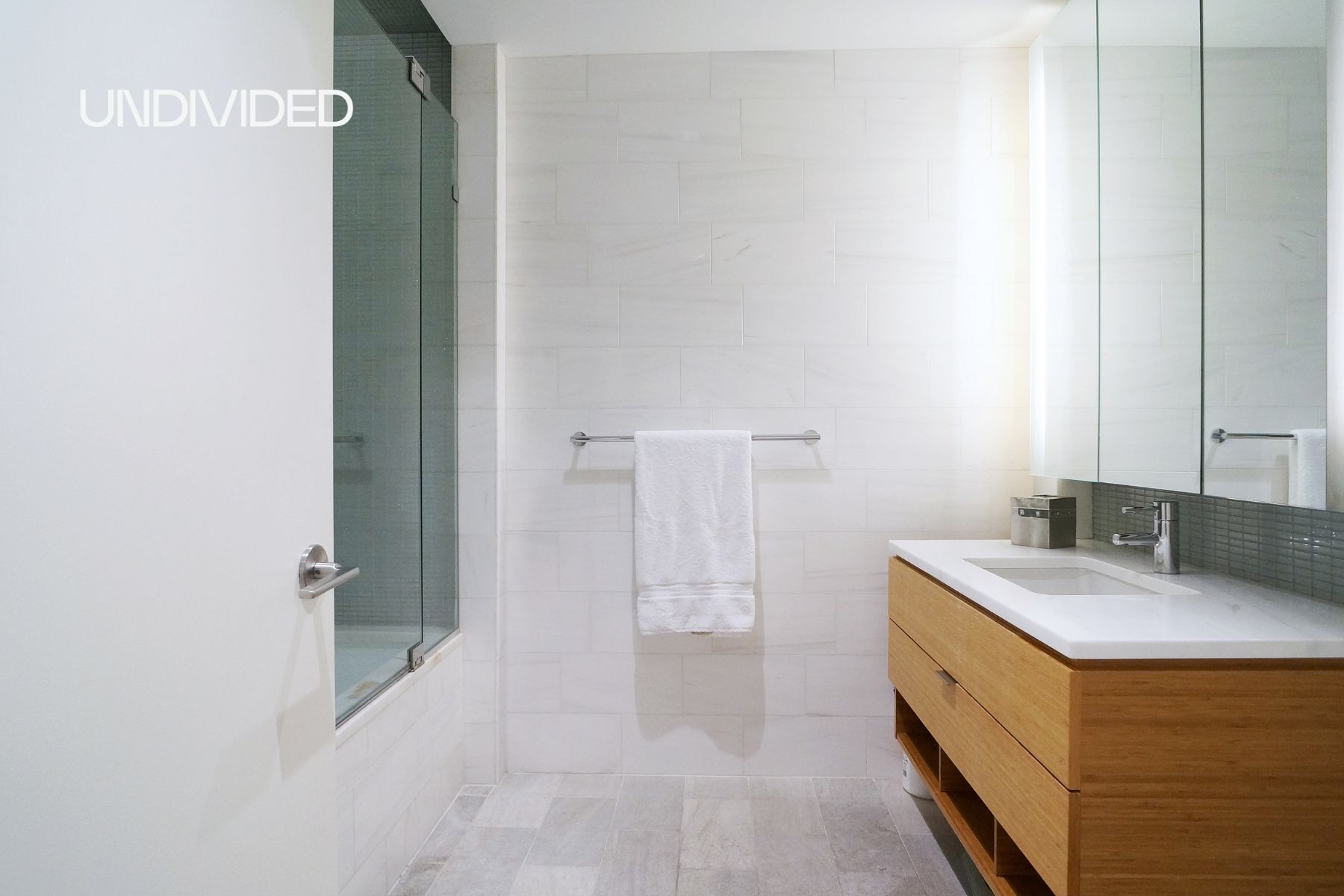 Residence 6F at 303 East 33rd Street offers approximately 874 square feet of modern, corner living with bright, north and east exposures. It is a one bedroom plus den, which can also be used as a home office. The eco-friendly bamboo flooring throughout adds warmth while the bright white finishes sets a modern tone. It has an open kitchen with a large island and custom bamboo cabinets. State of the art appliances include Bosch dishwasher, oven and cook top, and Liebherr Refrigerator. The spa-like bathroom has Bianco Dolomiti white marble walls, quartzite floors and glass wall tiles in the bath/shower. The custom bamboo vanity has extra storage features. The apartment also has a Bosch washer and dryer. The large bedroom has a walk-in-closet. Residents of 303 E 33rd gain exclusive access to amenities that include a 24-hour concierge, resident lounge, and an entertainment area. Enjoy the serenity of the exterior garden courtyard showcasing a working fireplace. In the basement is a bike room, a separate private storage room, a fitness room, and a laundry room. The crown jewel is the 5,000 SF rooftop garden on the 12th floor, perfect for lounging on the sun deck and catching views of the East River. The recreational area provides a barbecue grill and an area for playing mini-golf. Perched at the junction of Kips Bay and Murray Hill, 303 East 33rd is one block from NYU Langone, with Bellevue and the VA Medical Center moments away, as well as the 6 train, Grand Central, Midtown Tunnel, and FDR Drive, ideal for getting anywhere in or out of the city with ease. Just moments from Trader Joe’s, Fairway, AMC Kips Bay, and the area’s best restaurants and cafes, this home offers the best of Manhattan living with a sustainable edge.