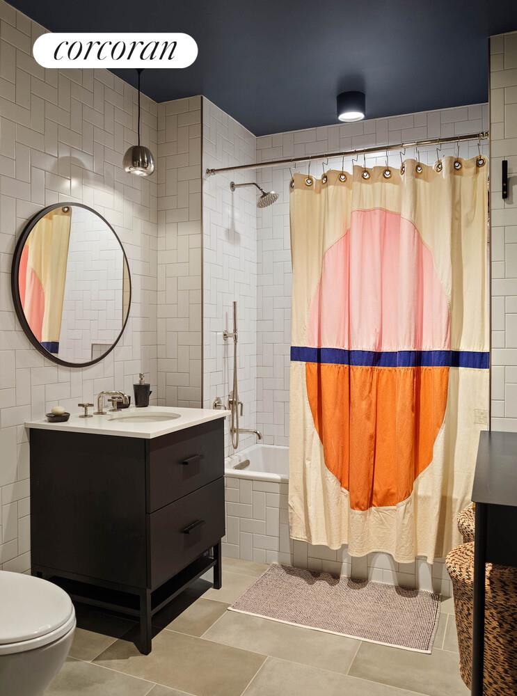 The open floor plan allows an easy flow between the kitchen and the living space. The living area features a striking custom floor-to-ceiling bookshelf thoughtfully designed by Nina Blair, to serve as both a functional storage solution and a statement piece. It adds warmth and sophistication while enhancing the space's character and appeal. The L-shaped classic contemporary kitchen is fitted with custom shaker white cabinetry, Bertazzoni, Bosch stainless steel appliances and marble countertops that match the marble backsplash. As for the generously sized bedroom, it comfortably fits a king sized bed as well as a home office, and offers 2 oversized closets. Additional customization includes integrated dimmable bedside lighting for added luxury and convenience. A spa-like bathroom finished with marble walls, Restoration Hardware lighting and a custom vanity complete this wonderfully crafted home.