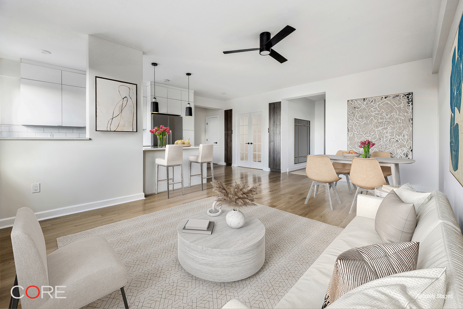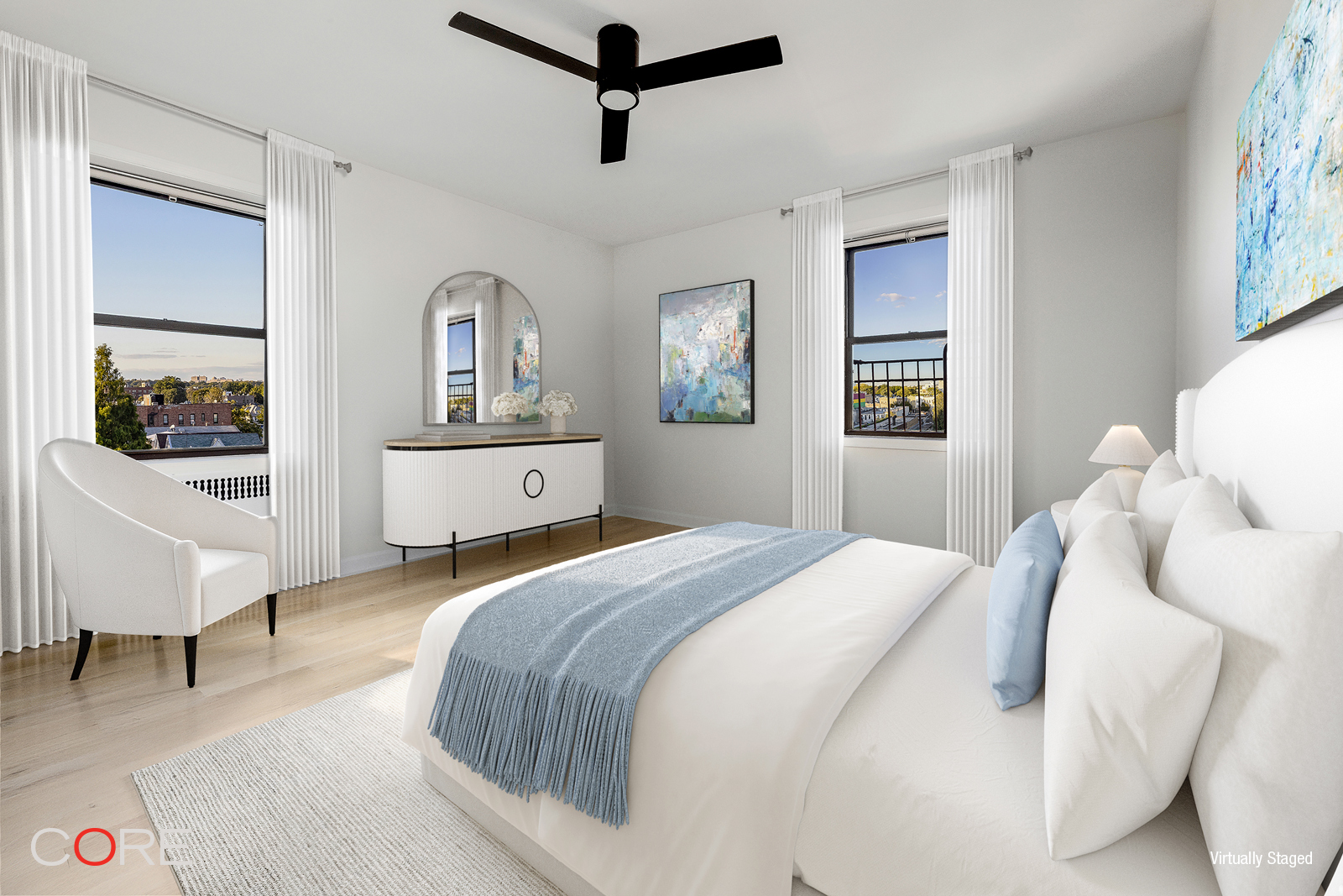 Welcome to Apartment 6K, an exceptionally spacious and airy top-floor oasis blending pre-war charm with a contemporary and thoughtful top-to-bottom renovation. Generously proportioned and bathed in natural light with unobstructed views of Manhattan, this peaceful corner one-bedroom sanctuary features a separate, fully-enclosed home office/guest room with French doors and an impeccably designed open-concept kitchen and spa bath exemplifying the modern ideal in luxury, practicality, and beauty. The residence offers approximately 965 SF of living space; measurements are subject to verification. New bespoke renovations include an open-concept chef’s kitchen with updated appliances, including Fisher & Paykel refrigerator with subzero, an under-counter Sharp microwave, a panel-ready Blomberg dishwasher, a five-burner Frigidaire gas range with self-cleaning oven, under-counter LED lighting and pendant lights, a breakfast bar, custom flat paneled cabinetry, and a plethora of storage throughout the apartment. A fully enclosed home office/guest room with French doors and a ceiling fan has also been added to the apartment’s original plan. The beautifully renovated windowed bath features floor-to-ceiling tiles, a 16" cast iron tub with glass shower door, LED touch-lit vanity, sleek new fixtures, and a linen closet. Generous storage options include a large coat closet in the entryway, an oversized walk-in closet in the back hall, two built-in closets with shelving just outside the home office, a linen closet in the bath, and two large closets in the bedroom, fully outfitted with the Elfa System and a charming original built-in bookcase off the living room. Other notable features include high ceilings, new four-inch white oak plank flooring, modern ceiling fans in every room, recessed lighting, and an expanded electrical panel with additional outlets added throughout the apartment. Built in 1941, the building maintains its pre-war charm, including a beautiful lobby with original terrazzo floors, two elevators, and wide interior staircases between floors. A new video intercom has been installed at the building’s front door, solar panels have been installed on the roof, there is laundry in the building, bike storage is available, storage cages are waitlisted, and a new playroom has been added for residents’ enjoyment. 811 Cortelyou is a superbly maintained cooperative community with an on-site super and porter. Pets are allowed on a case-by-case basis. Cortelyou Road is the hub of Ditmas Park’s retail, restaurant, and transportation corridor and is a short distance from Prospect Park. The famed Flatbush Food Coop, specializing in vegan and organic food options, is nearby with the wonderful Cafe Madeline and many other excellent restaurant choices along the way. Convenient transportation options include the Q Express, B and F trains, just 25 minutes to Manhattan, an Express Bus to Manhattan, and the B68 to Park Slope and Downtown Brooklyn. Assessment of $141.25 through Dec. 31, 2025.