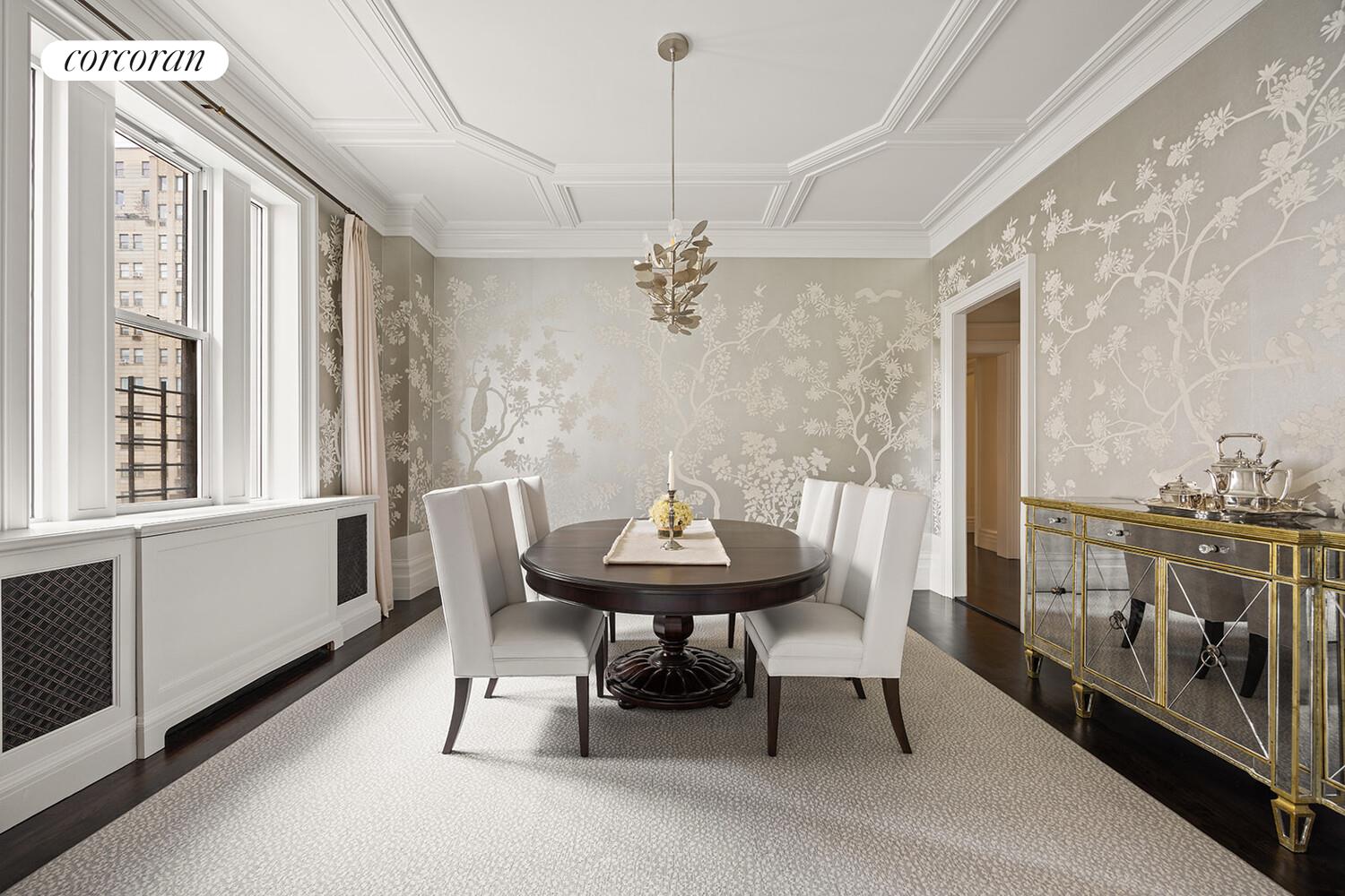 From the inviting entry gallery, you are welcomed into a grand living room with soaring 10'9" ceilings, intricate crown moldings, a stately gas fireplace, and leafy vistas over double-wide 96th Street. Elegant French doors lead to a dining room of impressive scale, adorned with custom wall treatments, antiqued mirrors, and a coffered ceiling, creating a perfect setting for formal entertaining. A richly paneled library offers versatility as a study, media lounge, or intimate retreat, while a refined powder room completes the sequence of public rooms.
