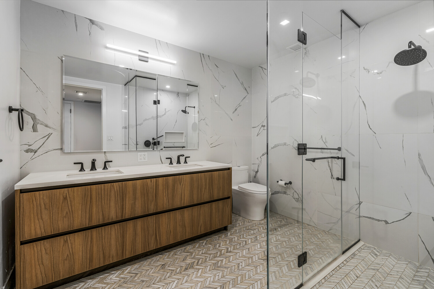 The open kitchen features a Calacatta Quartz waterfall island, Italian Cesar cabinetry, and a fully integrated Miele appliance package. The primary suite includes two walk-in closets and a spa-like bath with a rain shower, matte black Kohler fixtures, and Calacatta tile. A second bedroom and full bath offer flexibility for guests or office use. Additional highlights include in-unit W/D, a foyer with closet storage, and 2 DEEDED storage units on the 6th floor that can be combined.