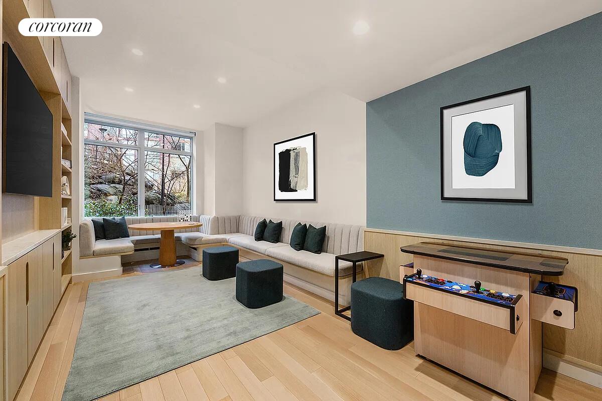 Within The Solaire, amenities conceived by COOKFOX Architects elevate daily life to the level of art. A residents' lounge opens to the greenery of Teardrop Park with a catering kitchen, dining room, and intimate reading nooks. A landscaped roof terrace frames sweeping river panoramas, outfitted with multiple seating and dining areas and BBQ grills. Wellness is at the forefront, with a state-of-the-art fitness center and private training studio with virtual systems, as well as a children's playroom and screening room for communal moments. Residents enjoy the convenience of a 24-hour concierge, live-in resident manager, porter service, bike storage, and on-site parking with EV charging.