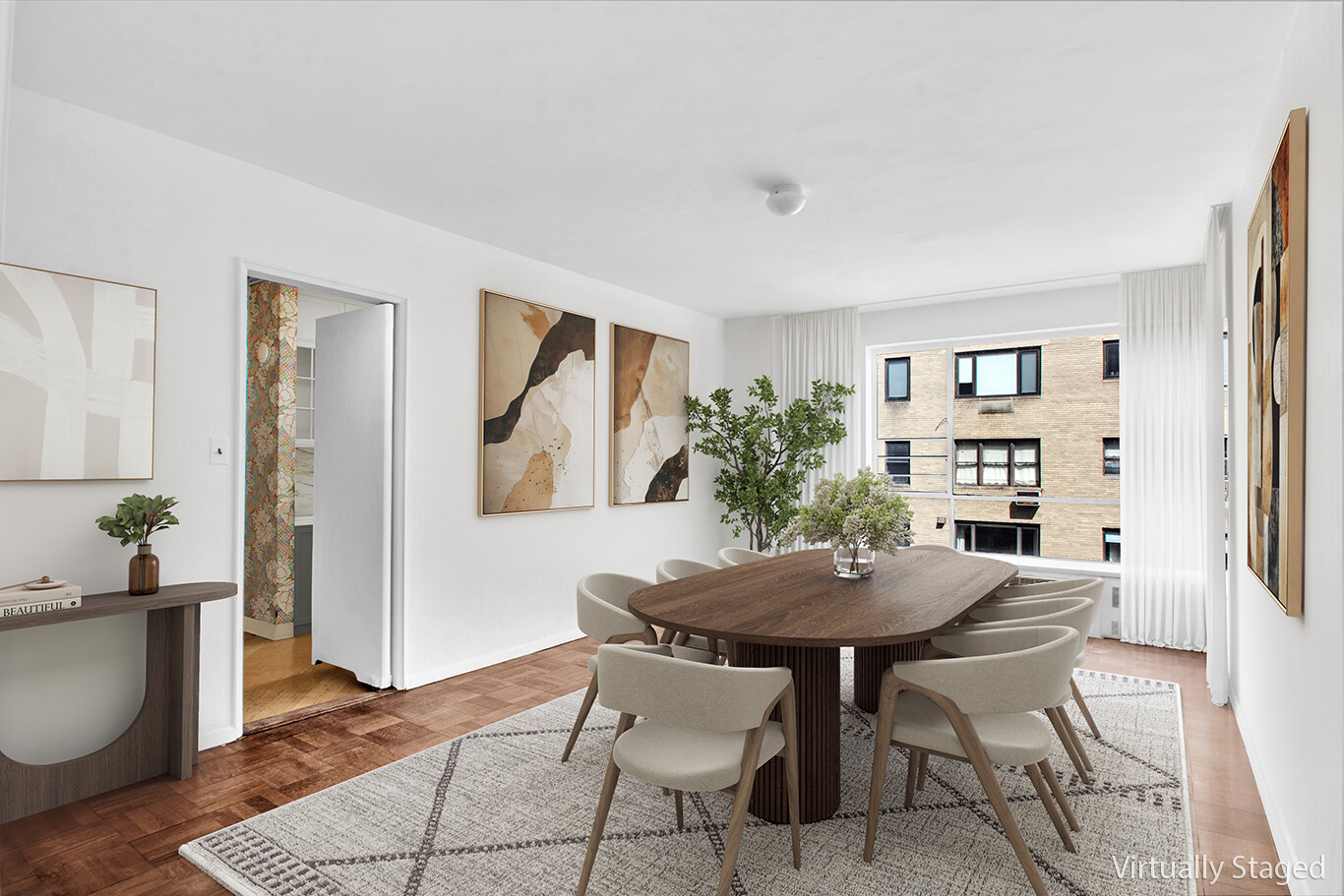 A 50' expanse from the Living Room to the Formal Dining Room takes you from breathtaking southern views across 86th Street, over the Neue Gallery, Central Park, and the majestic prewar buildings of Central Park West to the glittering towers of Billionaire's Row. The north and east corner windows of the Formal Dining Room look to open sky over townhomes below and to beautifully planted penthouses across to 87th Street.