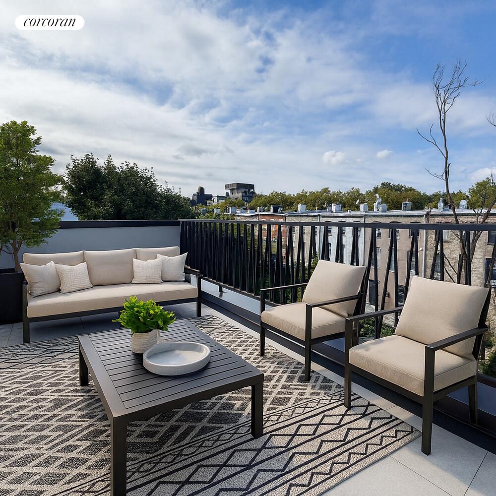 Upstairs are three additional bedrooms, two full baths with radiant heated floors and gunmetal fixtures, and another terrace. The garden floor offers a full-floor one-bedroom apartment with a large open concept kitchen and enormous bedroom.