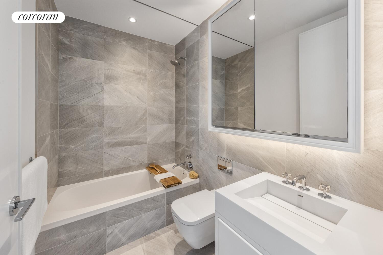 The north-facing primary bedroom boasts ample closet space, an en-suite bathroom elegantly ornamented with Bianco Dolomiti and Calacatta Gold marble, Toto Neorest water closets, and a soaking tub. The secondary bathroom is embellished with Italian custom-crafted lacquer wood vanities, honed cloudy mist marble floors and shower walls, glacier white Corian countertops with integral sinks, and Duravit water closets. Waterworks fixtures are throughout. Residence features include 5" solid oak plank quartered and rifted flooring, 4 pipe HVAC for year-round climate control.