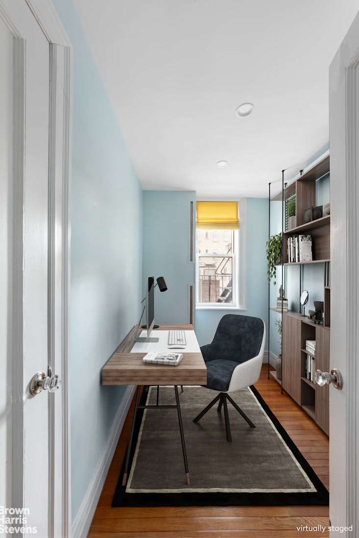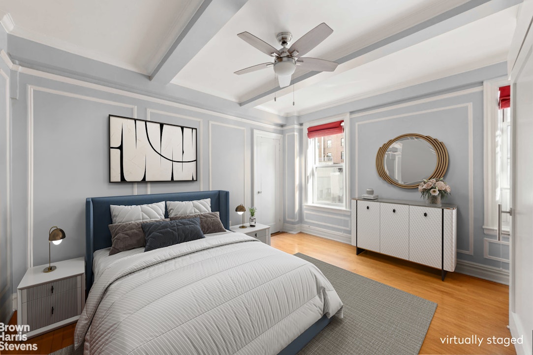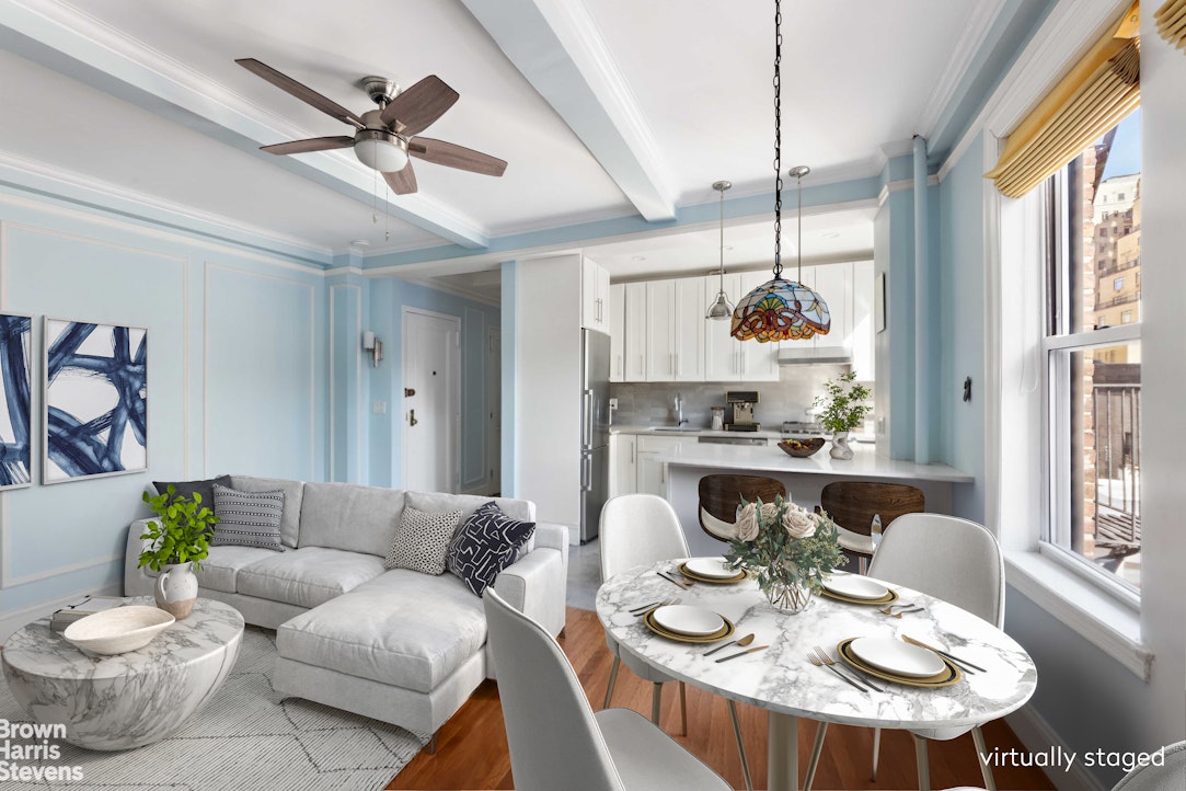 The windowed kitchen features high-end appliances including Bosch dishwasher, Blomberg fridge, and Berta stove with center island-perfect for cooking enthusiasts. The dining area adds to the functionality and charm of the space. Having a bonus den or office is a huge plus, offering versatility for working at home or accommodating guests. And with two full windowed baths, a rare find in NYC apartments, it offers both convenience and comfort.