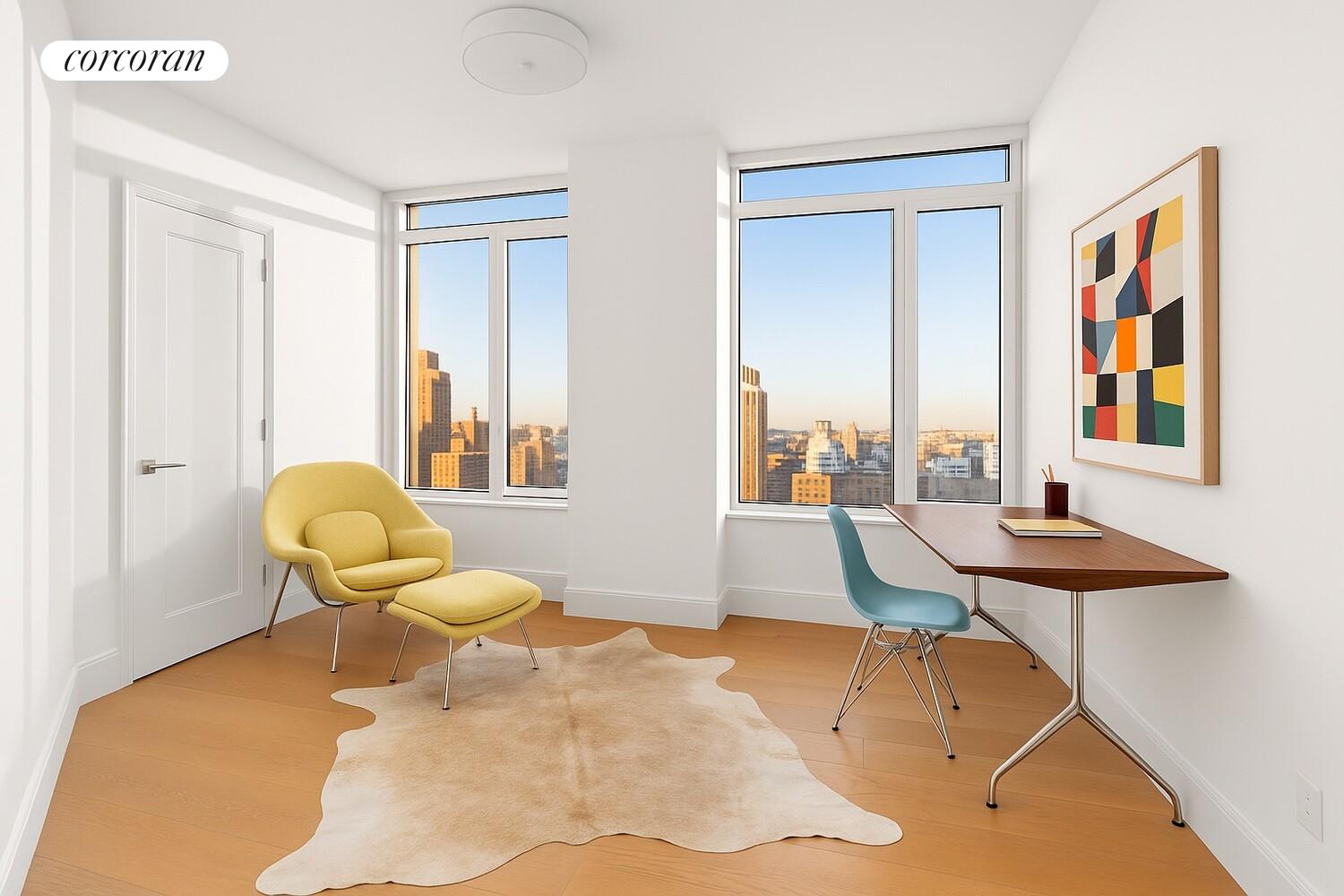 This three-bedroom, two-and-a-half-bath corner home captures breathtaking light and views in every direction: sunrises over Cadman Plaza Park, sunsets over the Manhattan skyline, and magical vistas of the New York Harbor and Statue of Liberty. Oversized windows and high ceilings create an airy feel throughout, while wide-plank hardwood floors and refined finishes bring warmth and polish to every room.