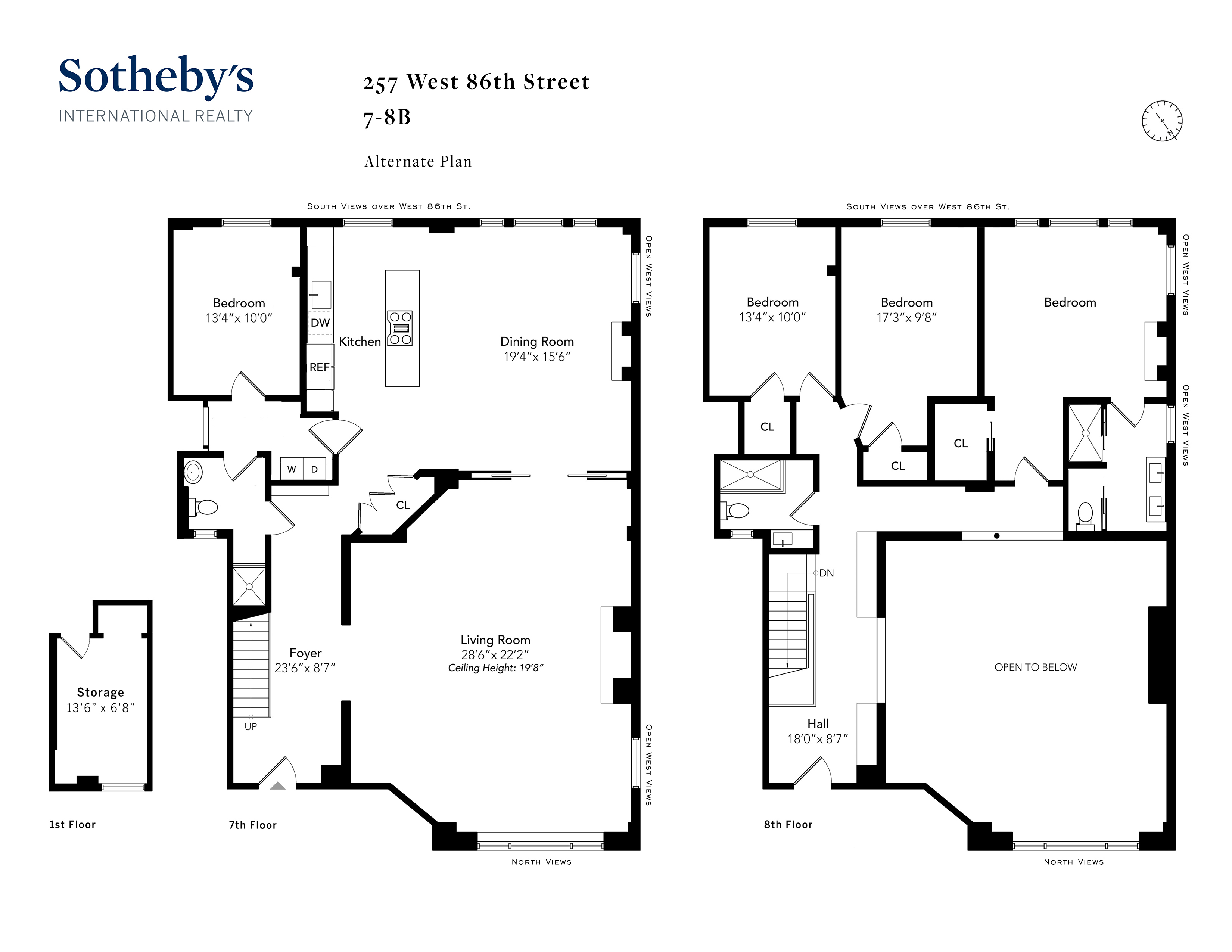 7-8B is currently configured as 3-4 bedrooms with a formal dining room and 2 full bathrooms, although the building’s other A and B-line duplexes typically have 3-bathrooms. The building allows expansive bathroom and kitchen layout improvements on approval. Private laundry is located off the kitchen, with new washer/dryer installations are also permitted. Adding further versatility, the sale includes a private, windowed room on the building’s ground floor—originally one of several staff rooms located just off the lobby—now perfectly suited as a secure personal archive or family collection space.