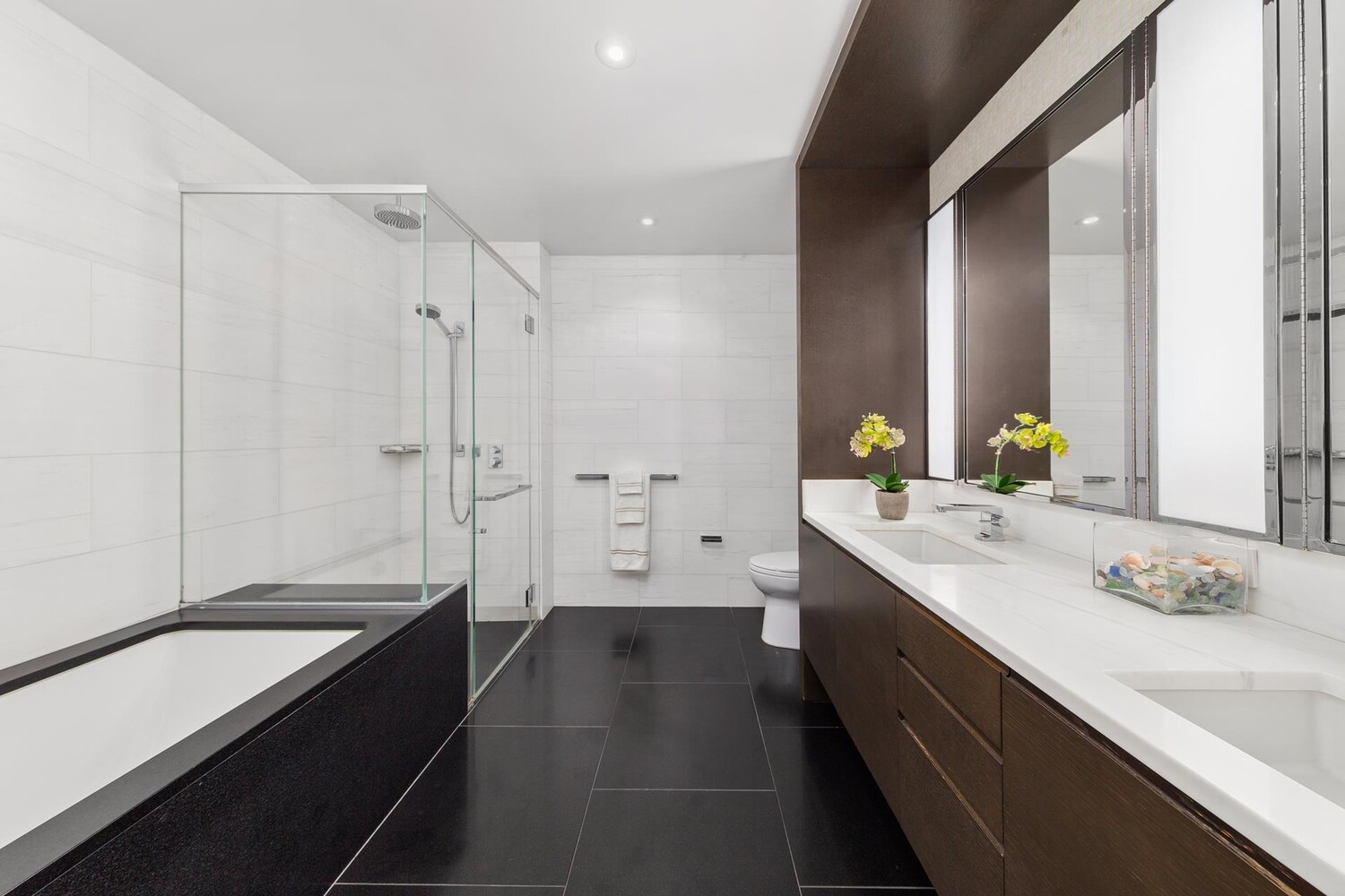 The split bedroom layout ensures privacy, with both bedrooms offering large walk-in closets designed by California closets. The primary bathroom exudes luxury with marble finishes, Dornbracht polished chrome fixtures, and a double-sink vanity. Enjoy a spa-like experience with a deep soaking tub and a glass-enclosed shower with a rainfall showerhead. The second bathroom offers a bright, elegant atmosphere with glossy white wall tiles and a white polished lacquer vanity.