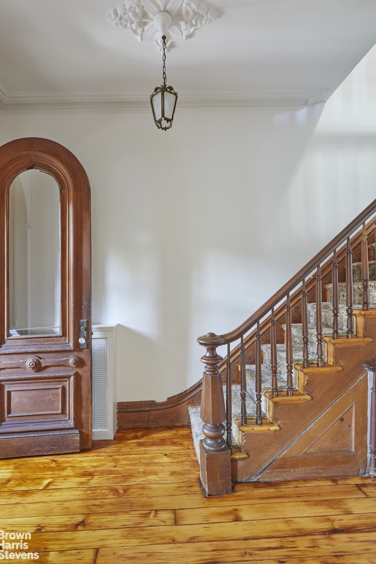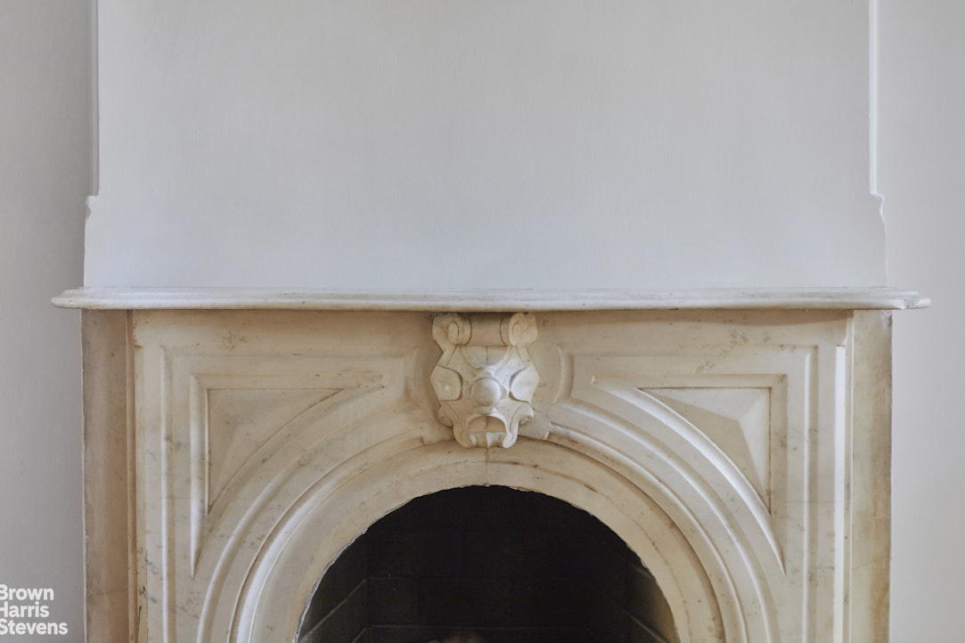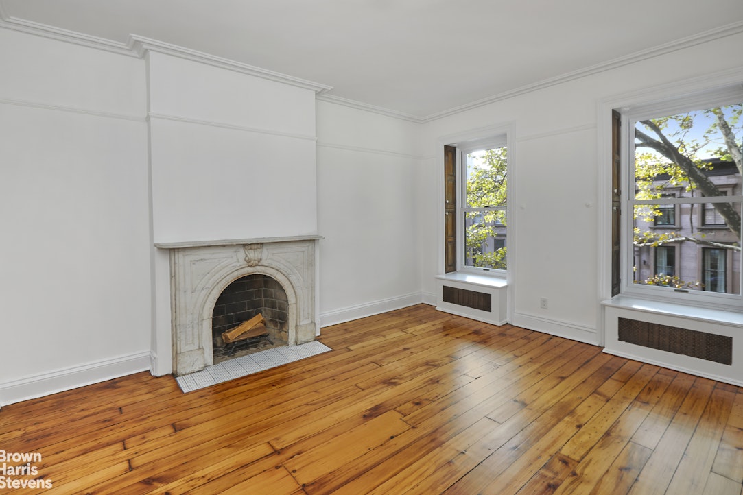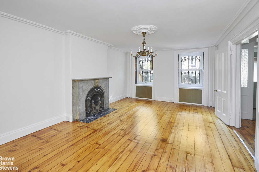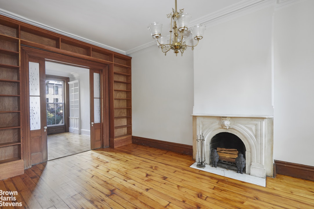 Entering through the large arched stoop doors, you are greeted with a gracious parlor floor with almost 11' ceilings. The large windows flood the entertaining space with sunlight. The two public rooms still have the original matched marble fireplaces, beautiful plaster moldings, and original tin ceilings in the rear parlor. They are separated by pocket doors with etched glass panels. A small office is just off the hall in the rear of the house.