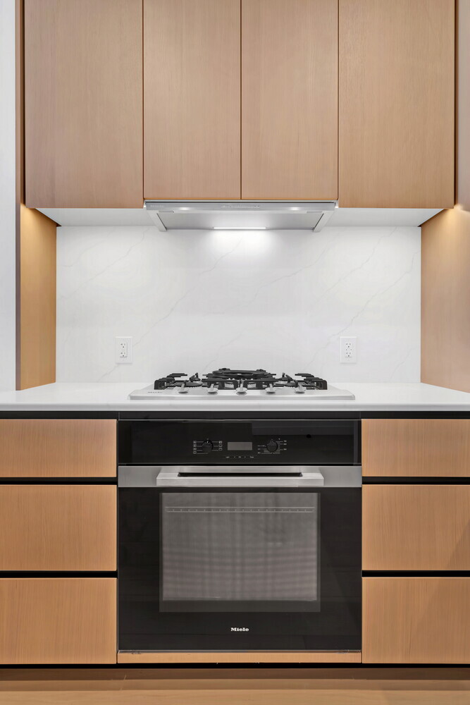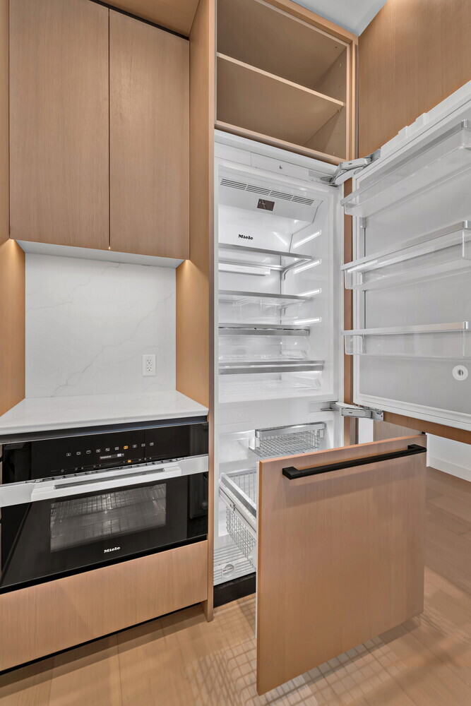The state-of-the-art chef's kitchen is outfitted with premium Miele appliances, a Sub-Zero refrigerator with an oversized freezer, and a Samsung washer and dryer for the great in-home convenience.