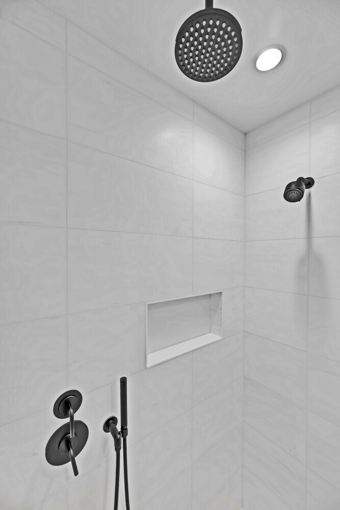 The spa-inspired bathroom is generously sized and features a spacious stall shower comfortably large enough for two. Outfitted with sleek, modern hardware, it's designed to offer maximum comfort and a truly relaxing experience.