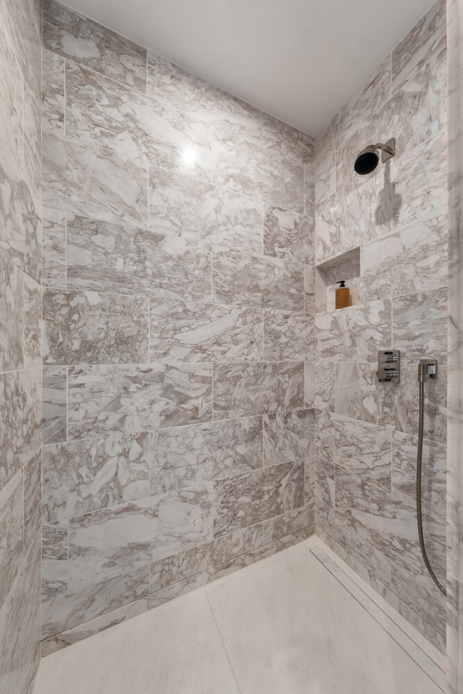 The corner primary bedroom features an expansive walk-in closet and en-suite primary bath. The serene primary bath offers Bianco Dolomiti radiant heated flooring underfoot, an enclosed shower, and a separate Kohler tub with Marno Illusion marble details. A custom vanity with white oak, rift-cut wood veneer millwork, and Marno Illusion countertops is completed with a built-in medicine cabinet, Kallista Sink and Dornbracht Fixtures. A unique powder room features a dramatically veined Nero Maquina vanity countertop, ebony stained oak quarter cut wood veneer vanity and Nero Maquina floors. An eye-catching Cobalt Flash marble wet wall, Dornbracht fixtures and a Kohler Corbelle toilet offers a striking contrast against the dark woods and stones. A Nest Learning Thermostat and Bosch washer and dryer complete this elegant residence.