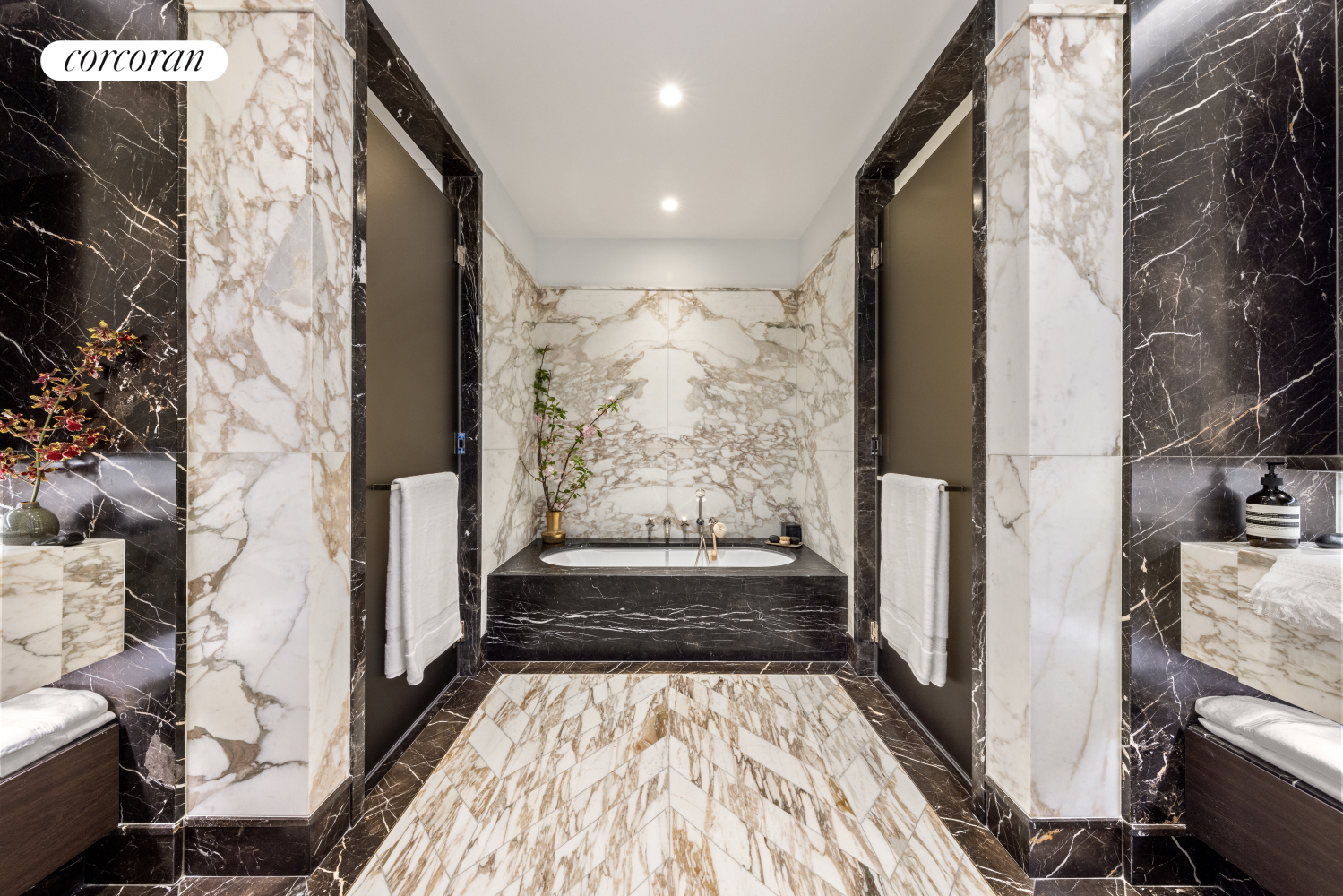 The primary suite, complemented by floor-to-ceiling windows welcomes an abundance of natural light throughout the day and includes two oversized walk-in-closets. The luxurious five-fixture bathroom is dressed in Arabescato Vagli Oro and Saint Laurent Marble and has radiant heat floors, custom double vanity and sink, integrated illuminated medicine cabinets, and a Saint Laurent marble-clad tub and separate glass-enclosed shower. Both secondary bedrooms have ensuite baths outfitted in stone and Staturio Marble with a custom oak vanity, premium appliances, and radiant heat floors.