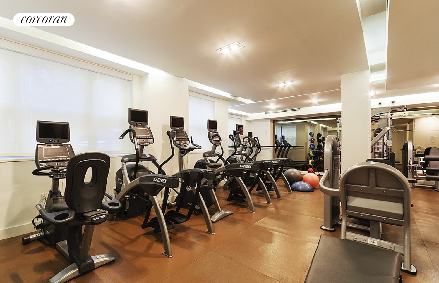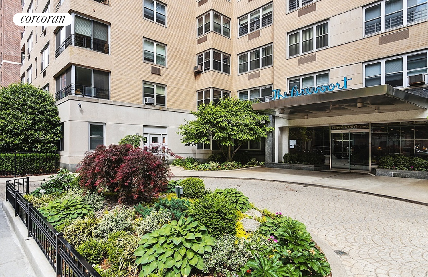 Building amenities at The Brevoort include a circular driveway, an opulent 24-hour attended lobby, a guest seating area, a viewing garden with a fountain, multiple elevators, a spacious gym, a laundry facility, and concierge service.