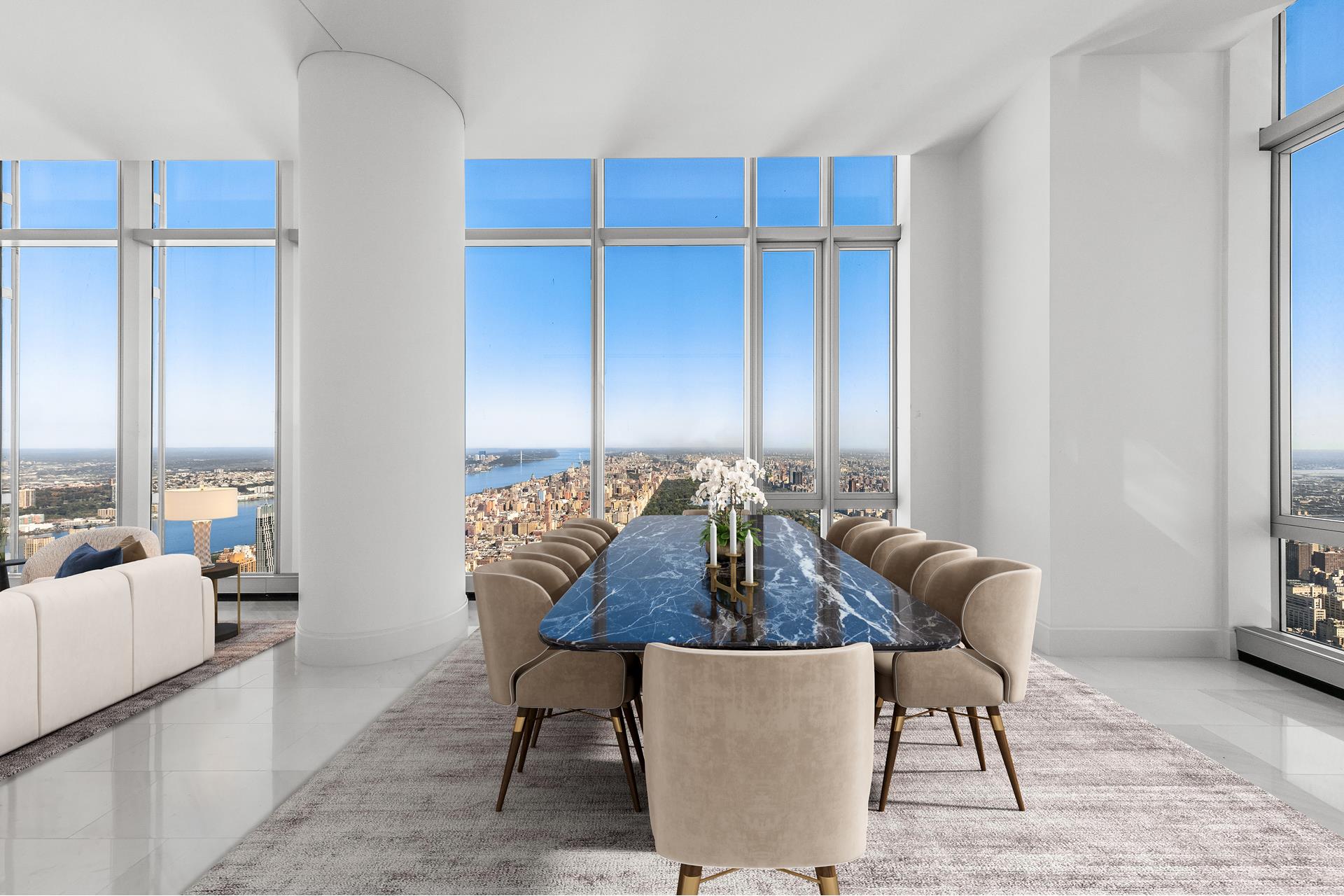 Perched 1,000 feet above New York City, this stunning 4 bedroom, 4.5 bath, half-floor residence at Central Park Tower boasts 4,295 square feet of ultra luxury living space AND THE HIGHEST CEILING OF ANY UNIT. The soaring 13'6 ceilings, coupled with a state of the art sound proof glass curtain wall spanning the entire residence, provides a glorious open and airy living environment. A formal entry foyer and gallery lead to an expansive great room offering sweeping north direct park and river panoramas. A spectacular corner gourmet eat-in windowed kitchen/family room features stone slab counters with an under-mount sink, Miele fully integrated appliances including a built-in coffee/espresso system and custom cabinetry by Smallbone of Devizes.