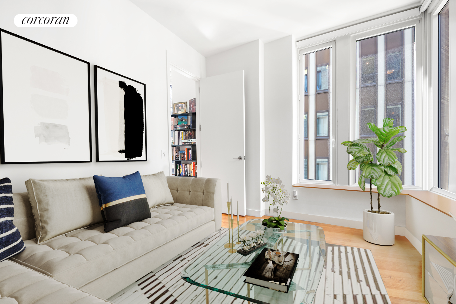 This modern 2 bedroom, 2 bathroom residence with south eastern exposure fills the apartment with natural sunlight! The long Entry Foyer leads to a spacious Living/Dining Room with a wraparound wall of windows facing south and west. The open chef's kitchen boasts custom designed cabinetry, Caeserstone counter and high-end appliances. The large Master Bedroom suite offers stunning views and double closets. The master bathroom includes custom deep soaking tub, a separate rain shower and a large dressing area as part of the bedroom suite. Residents of 15 William Street have access to an unparalleled set of amenities including 24-hour attended lobby, Penthouse Sky Lounge/Terrace, children's playroom, fitness center, yoga-Pilates studio, quash court, 50 ft. lap pool, half basketball court, sauna and valet parking.