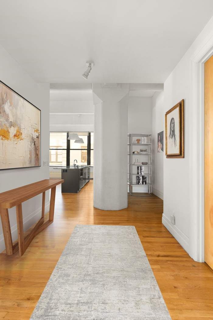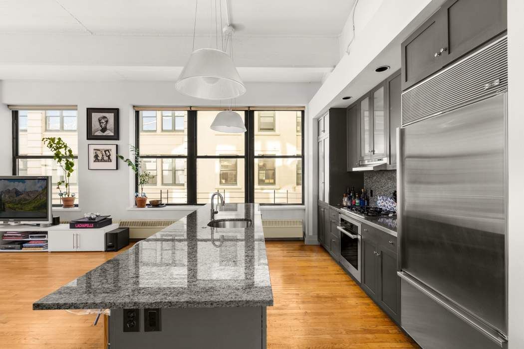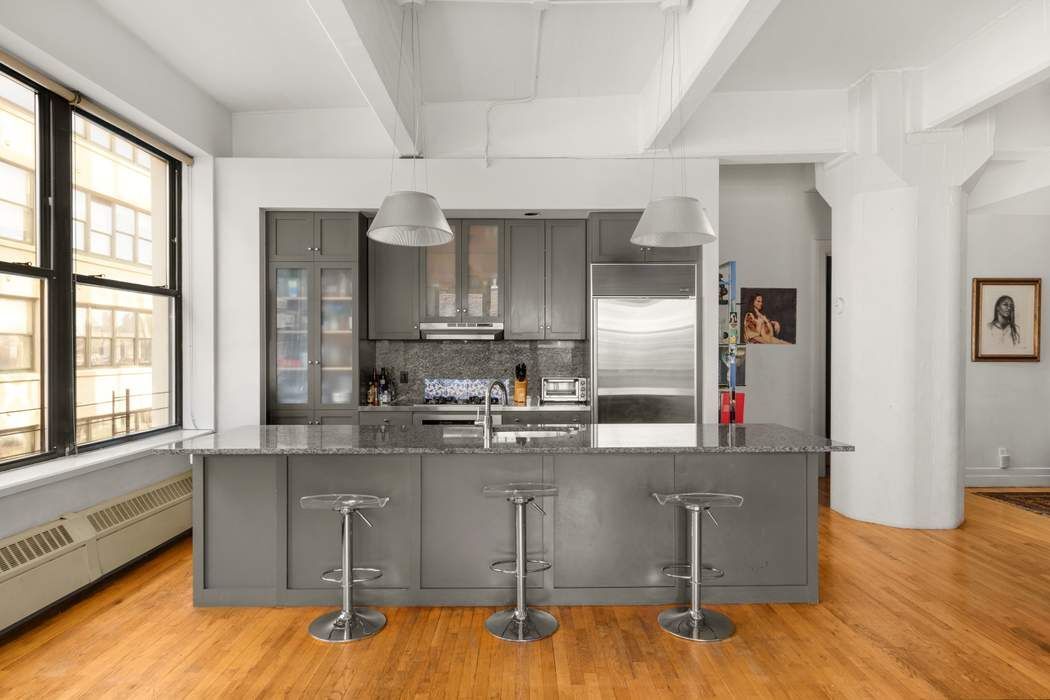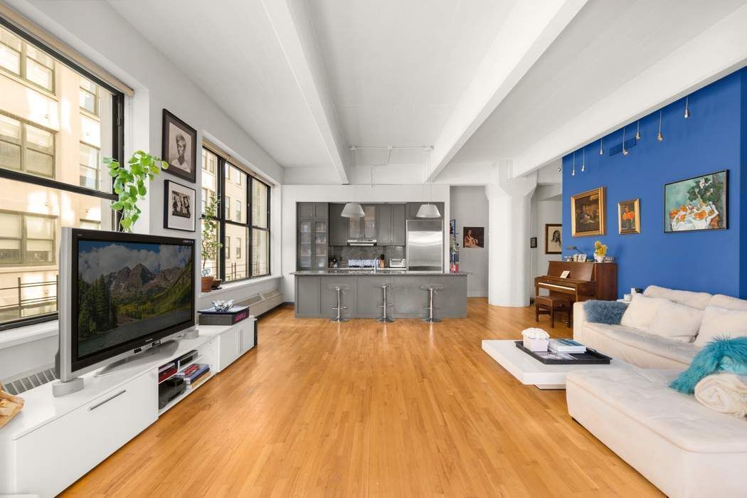 Upon entering through the spacious foyer, you’ll immediately be struck by the impressive scale of this open concept space. This expansive, light-filled living area features walls of oversized windows that wrap the southern and eastern exposures along with one picturesque north-facing window that perfectly frames the Manhattan Bridge. The soaring 11 plus foot concrete-beamed ceilings, hardwood flooring throughout, and the sheer size of this open and flowing floorplan truly makes this the definition of DUMBO loft living.