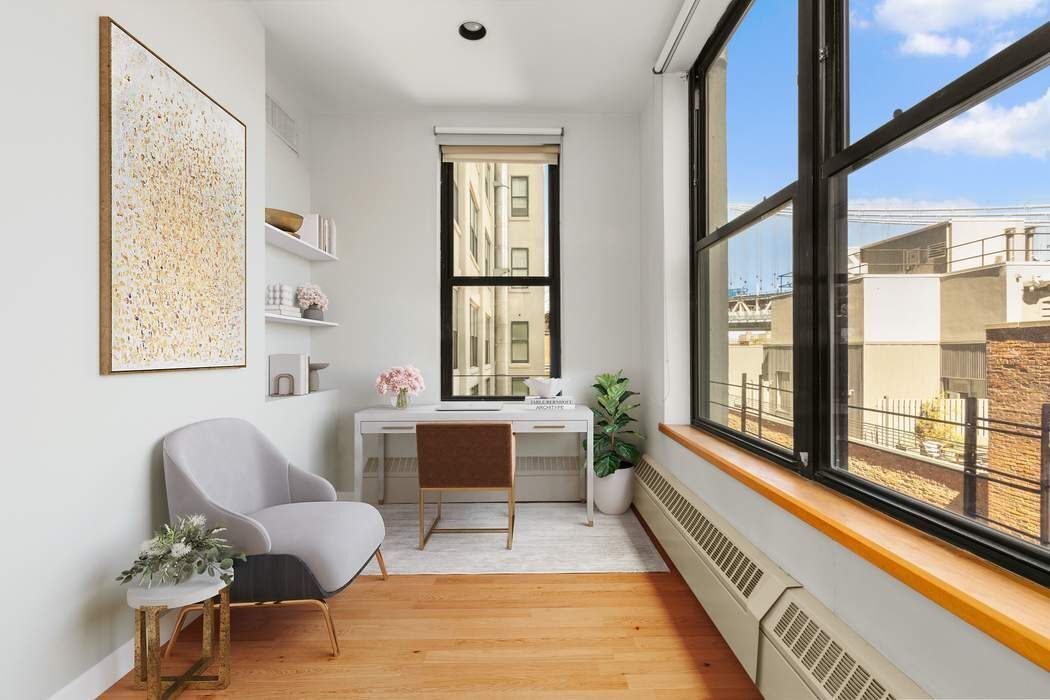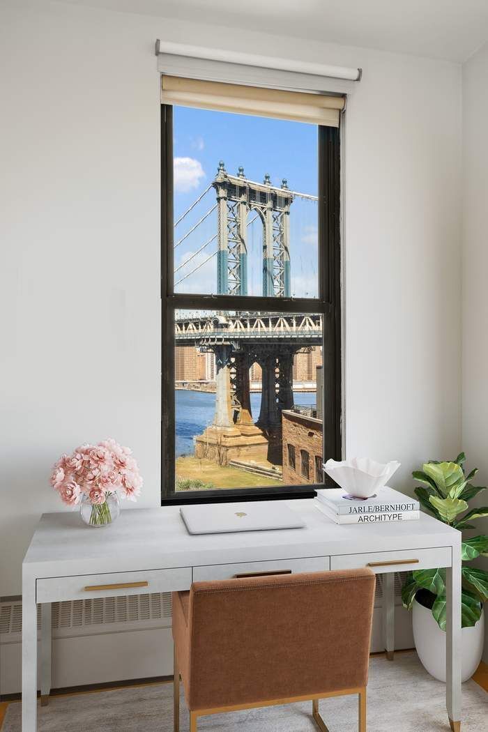 The massive sized primary bedroom boasts a spacious walk-in dressing closet and an en-suite bath featuring a sleek marble vanity, a deep soaking tub, and a separate enclosed shower. The generously sized second bedroom includes a large outfitted double-door closet and its own en-suite bath. Adjacent to the dining area is a reconfigured third bedroom offers ultimate versatility, this room is currently used as a work-from-home space highlighted with custom built-in storage closet and views of the Manhattan Bridge.