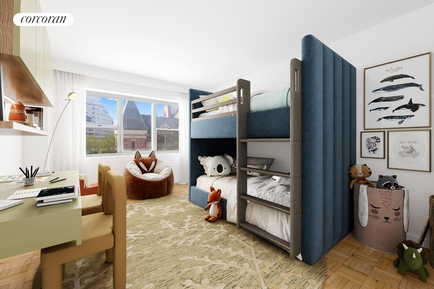 Both bedrooms boast west-facing windows, showcasing picturesque views of the Jefferson Market Library and its gardens. The spacious primary suite easily accommodates a king-sized bed, with plenty of room for additional furnishings. Two sizable closets offer abundant storage, while the ensuite bath provides enhanced privacy and convenience.