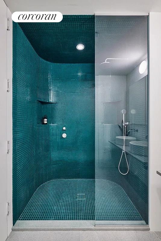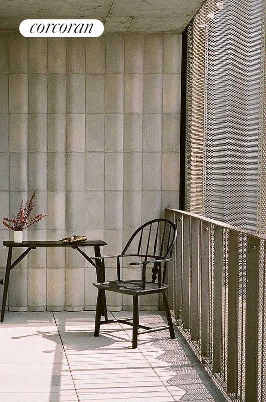 Residence 5C is a 1,164 SF, corner two bedroom, two bath home offering north, south and east exposures, a private entry landing, and covered loggia overlooking the neighboring cathedral. The loggia is framed by a beautiful, perforated screen, which allows light to filter in but provides added privacy and weather protection making it a true extension of the interior.The expansive great room allows for a large dining table, and generous living area with a wall of glass facing the loggia. The kitchen is the focal point, with its gorgeous organically shaped island functioning as an additional gathering space. The primary bedroom offers a full wall of closets, and a stunning en-suite bathroom with dual sinks and walk-in shower. The secondary bedroom has corner exposures, a built in desk and a windowed hall bath with a white glass mosaic tub/shower.
