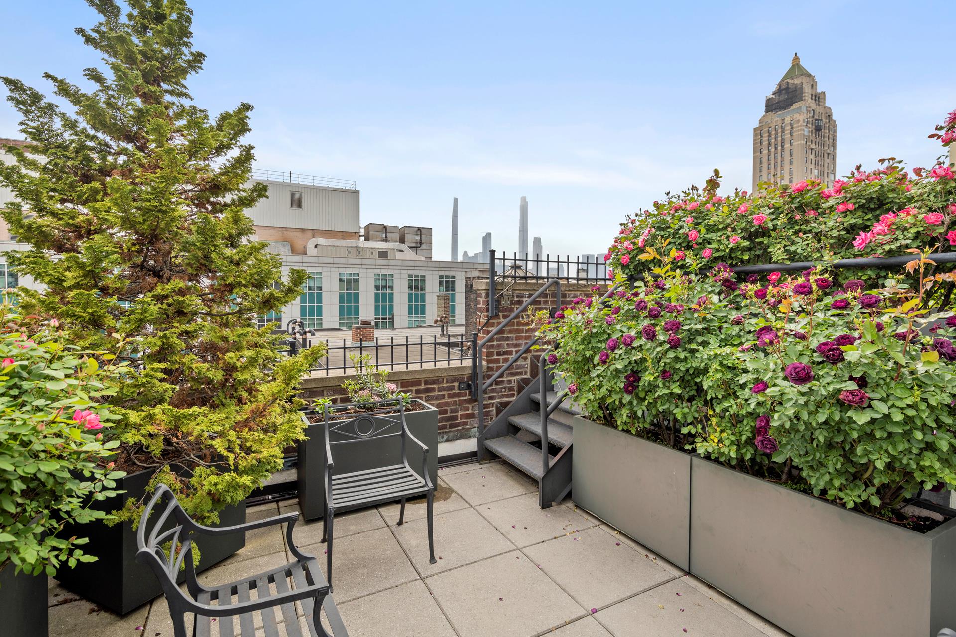 The sprawling 2 bedroom apartment features four exposures with unobstructed Manhattan skyline views, beautifully planted wraparound terrace with irrigation system, enclosed sun room, library with a wet bar, chef's state-of-the-art kitchen, formal dining room, pantry with full size wine cooler, private keyed-elevator, multi-zone central air conditioning, unique mahogany doors, oak hardwood floors, two wood burning fireplaces, laundry room, and generous closet space. The graceful layout provides an easy flow into each room with ultra-high ceilings and charming prewar details. The apartment is perfect for entertaining on a grand scale.