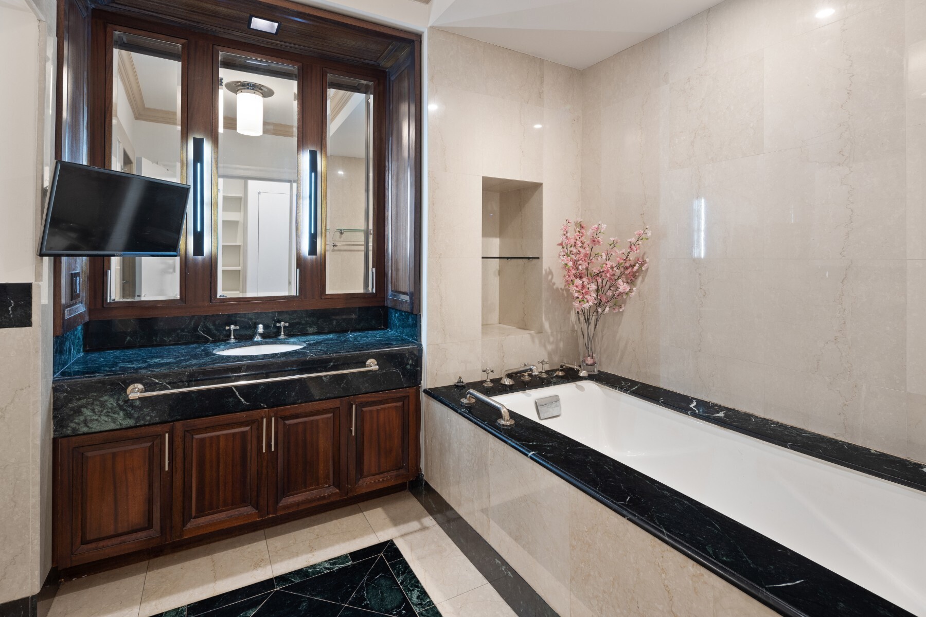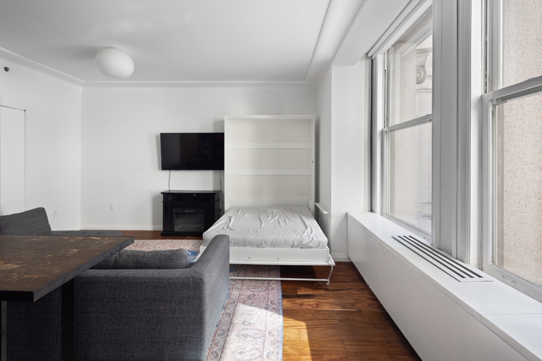• Immerse yourself in unparalleled luxury and historical grandeur at Unit 708, Cipriani Club Residences, 55 Wall Street. Nestled in the heart of Manhattans vibrant Financial District, this expansive studio condo elevates city living to an art form, offering a serene retreat on the world-renowned Wall Street. Spanning 659 square feet, this meticulously designed residence boasts a spacious entry foyer, versatile enough to transform into a cozy home office nook, perfect for todays dynamic lifestyle. The unit is defined by its lofty ceilings, expansive windows outfitted with custom solar shades, and wide plank mahogany flooring throughout, creating an ambiance of sophisticated warmth. Culinary enthusiasts will delight in the sleek, fully equipped kitchen, featuring state-of-the-art SubZero, Bosch, and Miele appliances, complemented by ample storage space. Convenience is paramount, with an in-unit Bosch washer/dryer and central air conditioning, ensuring comfort and ease. The living area, generous in size, can accommodate a king-sized bed or a space-maximizing murphy bed, alongside a beautifully outfitted closet, offering extensive storage solutions. High ceilings and a thoughtful layout enhance the sense of space and light, making it a haven of tranquility. Indulge in the luxury of the famously large, hotel-like bathroom, featuring a 6-foot marble bath, oversized soaking tub, and separate shower, designed to provide a spa-like experience within the comfort of your home. 55 Wall Street, a beacon of history and luxury, originally erected in 1842 and later expanded, stands as a testament to architectural brilliance and historical significance. Residents enjoy white-glove service, including a full-time doorman, concierge, and access to the common roof and garden, offering breathtaking city views. The bi-level fitness area and array of amenities underscore a lifestyle of unmatched convenience and luxury. Ideally located, this residence is steps away from major transit options, the New York Stock Exchange, and the vibrant dining and waterfront hotspots of the Financial District. The availability of shorter-term rentals and pied--terres adds a layer of versatility, making it an attractive investment or personal residence. Discover the epitome of luxury living at Unit 708, Cipriani Club Residences, where history meets modern sophistication in the heart of downtown Manhattan.