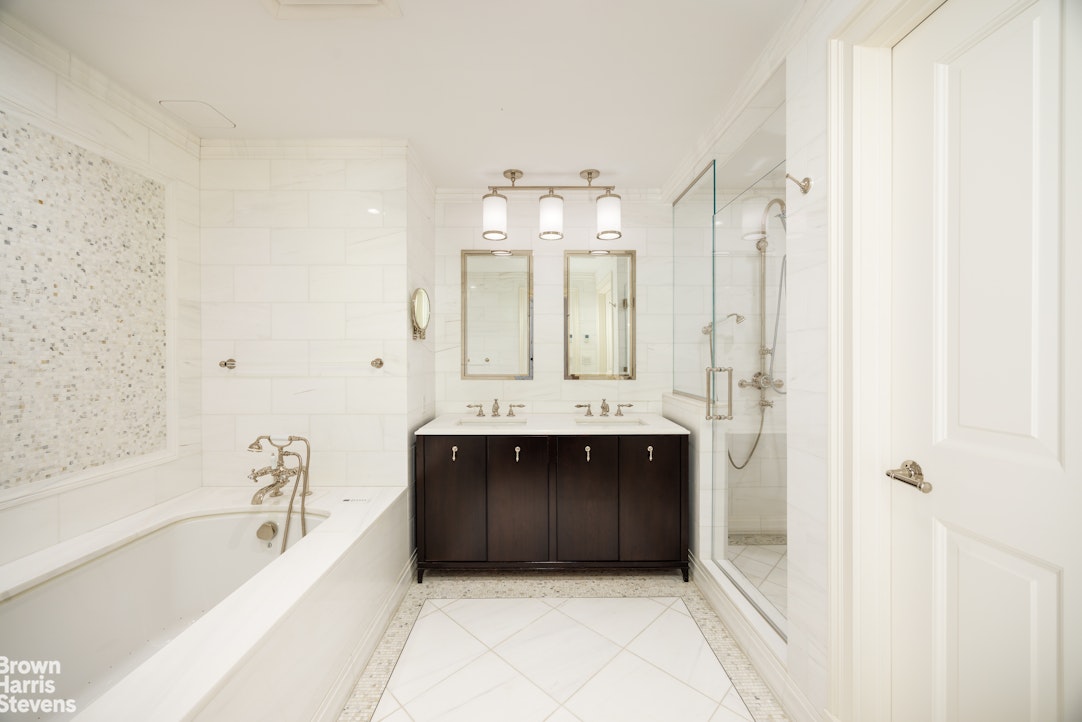 The bedroom wing features 3 bedrooms and three beautiful marble bathrooms, all with very generous closets. The oversized, double primary bedroom has custom built-ins, a huge walk-in closet and en-suite primary bathroom with Waterworks fixtures, double vanity, radiant heat flooring and Calcatta marble. It faces tranquil West End Avenue.